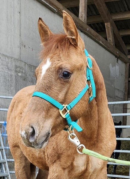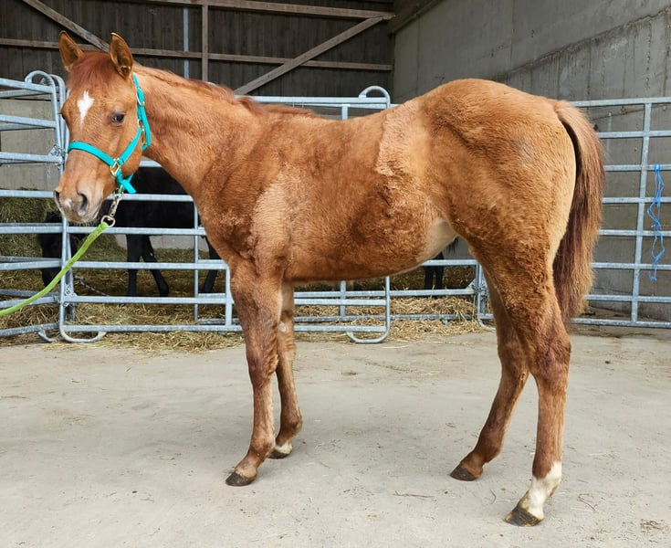 Sun O Lena Chexinic ist eine bildhübsche Quarter Horse Stute, geboren am 20.07.2025, mit einem geschätzten Endmaß von ca. 150 cm. Sie ist red dun und homozygot dun, die AQHA-Papiere liegen vor und sie ist in die DQHA einbezahlt. Die Stute überzeugt durch ihr korrektes Gebäude, ihre tolle Farbe, ihre gute Entwicklung und eine ausgewogene Bemuskelung. Sie ist gesund, regelmäßig entwurmt und wächst im Herdenverband auf. Tierarzt und Hufschmied sind ihr bekannt. 5-Panel n/n. Sie ist halfterführig und kennt das Fohlen-1×1. Charakterlich ist sie sehr lieb, menschenbezogen und brav im Umgang. Sie ist reaktionsstark, bringt ein tolles Temperament mit, ist sehr athletisch, möchte immer gefallen und lernt schnell, was sie zu einem spannenden Nachwuchspferd macht. Mit ihren in Europa seltenen Cutting-Pedigree ist sie ein erstklassiges Prospekt für Sport, Turnier und Zucht und sollte mit ihrem Potenzial für Cutting später unbedingt als Showpferd gefördert werden. Sie ist eine Enkelin von Doc O Lena und Bueno Chexinic. Eine junge Stute mit viel Qualität, Ausstrahlung und Leistungsbereitschaft, die sowohl für ambitionierte Reiter als auch für Züchter äußerst interessant ist.