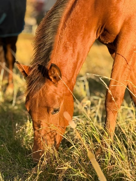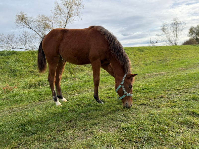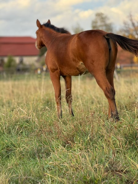 MD Pretty Miss Dunit - eine bildhübsche Quarter Horse/Paint Horse Stute, geboren am 11. März 2025. Sie präsentiert sich in der eleganten Farbe bay (braun) und wird voraussichtlich ein Endmaß von etwa 150 cm erreichen. Margie ist doppelt registriert bei der AQHA und der APHA, ihre Papiere liegen bereits vor. Bei der APHA-Fohlenschau in Könnern wurde sie mit der hervorragenden Wertnote 8,10 als 1a Prämienfohlen ausgezeichnet und belegte in ihrer Klasse den zweiten Platz. Unter insgesamt 18 Fohlen wurde sie zudem als zweitbestes Fohlen der gesamten Schau bewertet - ein Beweis für ihre hohe Qualität und ihr großes Potenzial. Diese junge Stute überzeugt durch ein sehr korrektes Gebäude, eine harmonische Bemuskelung und eine ausgezeichnete Entwicklung. Sie ist rundum gesund, wurde regelmäßig entwurmt, altersentsprechend geimpft und kennt sowohl Tierarzt als auch Hufschmied. Genetisch ist sie bestens abgesichert - sie ist 7-Panel n/n sowie LWO und Splashed White n/n getestet. Besonders auffällig sind ihre partiell blauen Augen, die ihr ein außergewöhnlich schönes und ausdrucksstarkes Erscheinungsbild verleihen. Margie wächst artgerecht im Herdenverband auf und genießt ganztägigen Weidegang. Sie erhält hochwertiges Futter, das optimal auf die Entwicklung von Sehnen, Gelenken und Knochen abgestimmt ist. Im täglichen Umgang zeigt sie sich freundlich, brav und ruhig. Sie ist aufmerksam, menschenbezogen und lernt sehr schnell. Das kleine Fohlen-ABC beherrscht sie bereits sicher, sie ist halfterführig und kennt die grundlegenden Routinen. Auch ihre Abstammung lässt keine Wünsche offen: Margie stammt aus einer erstklassigen Reining-Linie und ist DQHA-Futurity startberechtigt. Sie hat Colonels Smoking Gun/Remenic N Dunit /Arc Sparkle Surprise noch im Papier. Ihre athletischen Grundgangarten und ihre Leistungsbereitschaft lassen schon jetzt erkennen, dass sie sowohl für den Sport als auch für den ambitionierten Freizeitreiter hervorragend geeignet ist. Ob als zukünftiges Showpferd oder als treue Freizeitpartnerin - MD Pretty Miss Dunit vereint ein korrektes Exterieur, sportliches Potenzial und einen Charakter aus Gold. Für diese außergewöhnliche junge Dame wird ein liebevolles 5-Sterne-Zuhause gesucht, gerne mit der Möglichkeit, ihr Talent im Sport weiter zu fördern. Sie ist ab sofort bereit, in ihr neues Zuhause umzuziehen und ihren weiteren Weg mit Menschen zu gehen, die ihre Qualität zu schätzen wissen. NRHA Germany, PHCG Futurity und ins EWU Jungpferdeprogramm einbezahlt.