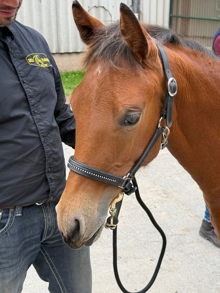 MD Pretty Miss Dunit - eine bildhübsche Quarter Horse/Paint Horse Stute, geboren am 11. März 2025. Sie präsentiert sich in der eleganten Farbe bay (braun) und wird voraussichtlich ein Endmaß von etwa 150 cm erreichen. Margie ist doppelt registriert bei der AQHA und der APHA, ihre Papiere liegen bereits vor. Bei der APHA-Fohlenschau in Könnern wurde sie mit der hervorragenden Wertnote 8,10 als 1a Prämienfohlen ausgezeichnet und belegte in ihrer Klasse den zweiten Platz. Unter insgesamt 18 Fohlen wurde sie zudem als zweitbestes Fohlen der gesamten Schau bewertet - ein Beweis für ihre hohe Qualität und ihr großes Potenzial. Diese junge Stute überzeugt durch ein sehr korrektes Gebäude, eine harmonische Bemuskelung und eine ausgezeichnete Entwicklung. Sie ist rundum gesund, wurde regelmäßig entwurmt, altersentsprechend geimpft und kennt sowohl Tierarzt als auch Hufschmied. Genetisch ist sie bestens abgesichert - sie ist 7-Panel n/n sowie LWO und Splashed White n/n getestet. Besonders auffällig sind ihre partiell blauen Augen, die ihr ein außergewöhnlich schönes und ausdrucksstarkes Erscheinungsbild verleihen. Margie wächst artgerecht im Herdenverband auf und genießt ganztägigen Weidegang. Sie erhält hochwertiges Futter, das optimal auf die Entwicklung von Sehnen, Gelenken und Knochen abgestimmt ist. Im täglichen Umgang zeigt sie sich freundlich, brav und ruhig. Sie ist aufmerksam, menschenbezogen und lernt sehr schnell. Das kleine Fohlen-ABC beherrscht sie bereits sicher, sie ist halfterführig und kennt die grundlegenden Routinen. Auch ihre Abstammung lässt keine Wünsche offen: Margie stammt aus einer erstklassigen Reining-Linie und ist DQHA-Futurity startberechtigt. Sie hat Colonels Smoking Gun/Remenic N Dunit /Arc Sparkle Surprise noch im Papier. Ihre athletischen Grundgangarten und ihre Leistungsbereitschaft lassen schon jetzt erkennen, dass sie sowohl für den Sport als auch für den ambitionierten Freizeitreiter hervorragend geeignet ist. Ob als zukünftiges Showpferd oder als treue Freizeitpartnerin - MD Pretty Miss Dunit vereint ein korrektes Exterieur, sportliches Potenzial und einen Charakter aus Gold. Für diese außergewöhnliche junge Dame wird ein liebevolles 5-Sterne-Zuhause gesucht, gerne mit der Möglichkeit, ihr Talent im Sport weiter zu fördern. Sie ist ab sofort bereit, in ihr neues Zuhause umzuziehen und ihren weiteren Weg mit Menschen zu gehen, die ihre Qualität zu schätzen wissen. NRHA Germany, PHCG Futurity und ins EWU Jungpferdeprogramm einbezahlt.