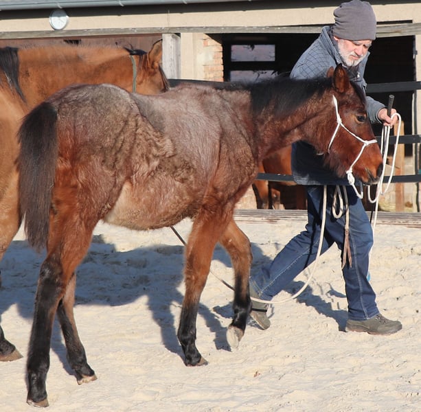 VALENTINA jest bardzo typowa, poprawnie zbudowana i towarzyska. Będzie bardzo niezawodnym partnerem na całe życie dla ambitnego jeźdźca rekreacyjnego lub sportowego. VALENTINA ma prawo do startu w DQHA i regionach Futurity. Przygotowujemy ją delikatnie do przyszłego życia metodami Natural Horsemanship. Swoje życie spędza w stajni otwartej na dużej łące w mieszanej grupie. Pod przyciskiem "Protokół treningowy" znajdą Państwo aktualny stan szkolenia.