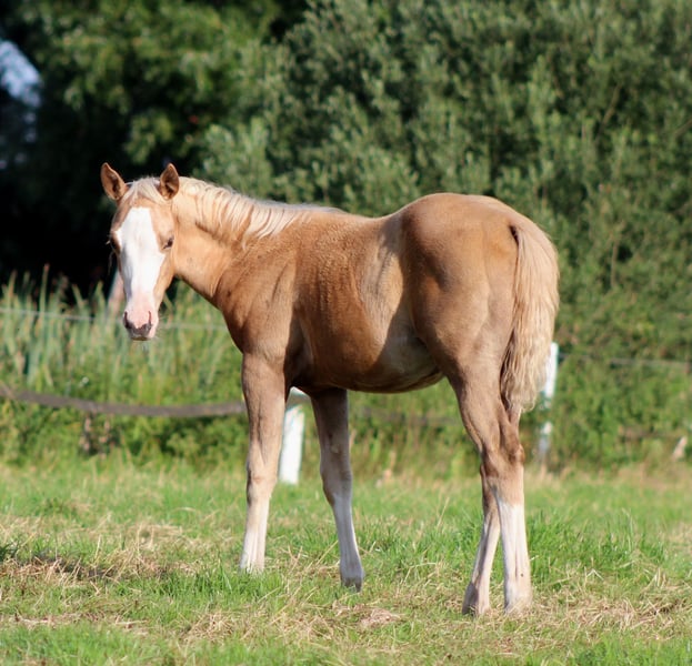 Zum Verkauf steht eine außergewöhnlich gezogene American Quarter Horse Stute, geboren am 10. April 2025, die in jeder Hinsicht höchste Ansprüche erfüllt. Diese junge Stute vereint erstklassige Genetik, modernes Exterieur und ein vielversprechendes Mindset für den Reining-Sport sowie für die hochwertige Zucht. In ihrer auffälligen Palomino Splash-Farbe mit breiter weißer Blesse ist sie nicht nur ein Blickfang, sondern präsentiert sich bereits jetzt mit harmonischem Körperbau, klaren Linien und einem geschätzten Endmaß von ca. 151 cm – ideal für den modernen Reining-Typ. Pedigree Der Vater TINKER WITH GUNS gehört mit zu der Weltspitze der Reining-Vererber. Als NRHA Million Dollar Sire ($1.254.000) mit eigenen Lifetime Earnings von $346.366 steht er für Leistungsbereitschaft, Trainierbarkeit und Champion-Mentalität. Seine Erfolge sprechen für sich, darunter mehrere NRHA- und NRBC-Derby-Titel sowie ein NRHA Open Derby Champion-Titel. Die Mutterlinie ist ebenso exquisit: Über YELLOROSEOFTEXAS führt das Pedigree direkt zu GALLO DEL CIELO, einem der einflussreichsten Hengste der Westernreitgeschichte. Als NRHA 4 Million Dollar Sire und NCHA Million Dollar Sire sowie Vollbruder zu Grays Starlight steht er für Vielseitigkeit, Vererbungskraft und nachhaltigen Erfolg in Reining, Cutting und Cow Horse. Nominierungen & Gesundheit Diese Stute ist genetisch 5-Panel N/N (PSSM, GBED, HERDA, MH, HYPP) und somit bestens für Sport und Zucht abgesichert. Sie ist nominiert für: NRHA Germany SSP NRHA Belgium Sire & Dam (über den Vater) EURO Futurity & Derby SilverSpurs Million Dollar Challenge (Germany, Italy, Austria & Euro Futurity) Charakter & Perspektive Neben ihrer genetischen Exzellenz überzeugt diese Jährlingsstute durch einen freundlichen, aufgeschlossenen und menschenbezogenen Charakter. Sie zeigt sich aufmerksam, korrekt im Umgang und mit der natürlichen Präsenz, die man bei zukünftigen Spitzensport- und Zuchtpferden sucht. Ein hochwertiges Prospect für Reining auf internationalem Niveau – ebenso interessant für ambitionierte Züchter, die Wert auf bewährte Blutlinien, Nominierungen und langfristige Qualität legen. Eine weitere Aufzucht bei uns ist nach Absprache gerne möglich. 📍 Besichtigungen nach Vereinbarung www.white-diamond-horses.de