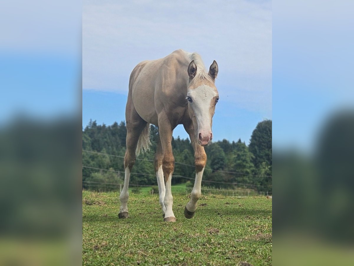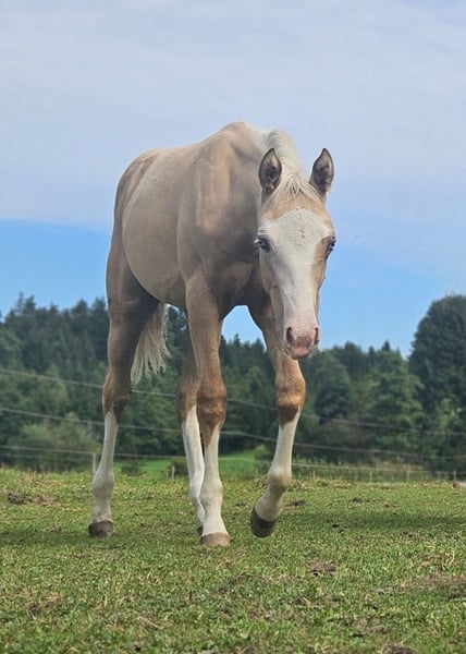 Zum Verkauf steht unser extrem schönes AQH Stutfohlen *3/25 in Traumfarbe palomino splash. Sie ist sehr harmonisch gebaut, mit sehr ansprechender Oberlinie und sehr süßem Köpfchen. Sie hat außerordentlich gute Bewegungen. Endmaß geschätzt 1,52m. Charakterlich ist sie sehr fein, bei"Hauruck" geht sie lieber. Alle Papiere & Pass sind beantragt. Abstammung: Spooks Grand Slam × Luna Flashpep. Abgesetzt, mit Tetanus grundimmunisiert, täglich gehändelt, täglich Kraft- und Mineralfuttergabe, dem Schmied vorgestellt, kann auf Wunsch zur weiteren Aufzucht bleiben. Standort 83128 Kontakt 01721616272