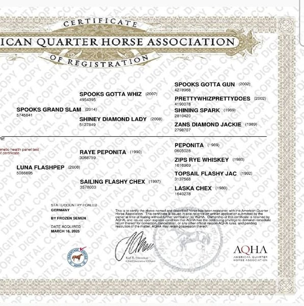 For sale is our stunning AQH filly foal born on 03/25, in the dream color palomino splash. She has a very harmonious build, with an attractive topline and a very sweet head. Her movements are exceptionally good. Estimated height at maturity: 15.2 hh. Temperamentally, she is very refined; she prefers to avoid rough handling. All paperwork and passport are applied for. Pedigree: Spooks Grand Slam × Luna Flashpep. Weaned, vaccinated against tetanus, handled daily, fed with daily grain and mineral supplements, introduced to the farrier. She can remain for further rearing upon request. Location: 83128 Contact: 0172 1616272