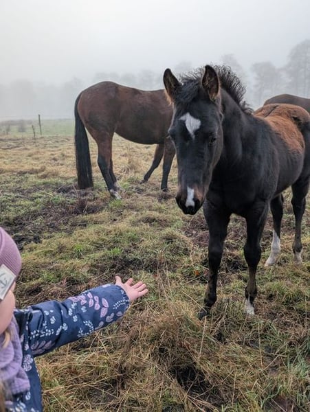 K Ka Kangaroo is a harmonious, affectionate filly with correct conformation and a solid foundation, sporting a black-brown coat. She holds papers from AQHA & APHA and is genetically tested via her parents, with 6 Panel N/N. A notable feature upon closer inspection are her blue-rimmed eyes, suggesting she may carry the color gene. Known as Kay, she exhibits expressive, elastic, and energetic movement and is curious about her environment and very people-oriented. Kay is raised in a small herd, ensuring she is well socialized. She has been regularly handled by the blacksmith, dewormed regularly, and has her equine passport. I envision her as a fantastic partner for leisure riding with potential for high-level competition in the show arena. The last four pictures show her parents (mother Sorrel & father Brown). UPDATE: Her sire, JJ Shining Footwork, recently won the EWU Young Horse Reining at his first competition during the Easter weekend and placed 3rd in Ranch Riding.