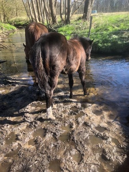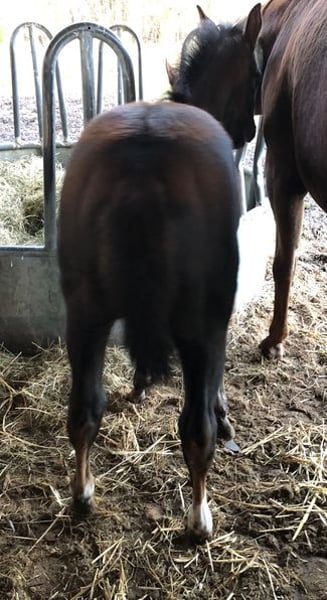 K Ka Kangaroo ist ein harmonischer verschmuster Stutjährling mit korrektem Körperbau und gutem Fundament in schwarzbrauner Jacke. Sie hat das Papier der AQHA & APHA und ist über ihre Eltern 6 Panel N/N. Als Besonderheit fällt bei nähren hinschauen ihre blau umrandeten Augen auf, so daß man davon ausgehen kann das "Sie" Farbgenetikträgerin ist. Kay wie wir sie rufen hat raumgreifende, elastische, schwungvolle Bewegungen und ist an ihrer Umwelt interessiert und Menschen bezogen. Kay wächst in einer kleinen Gruppe heran, so daß sie bestens sozialisiert ist. Schmied vorgestellt regelmässig Endwurmt und hat ihren Equidenpass. Ich stelle mir die Maus als tollen Freizeitpartner vor mit potenzial für den großen Sport in der Showarena. Auf den letzten 4 Bildern sieht man die Eltern (Mutter Sorrel & Vater Brown) UPDATE: Der Vater JJ Shining Footwork hat auf seinem ersten Turnier jetzt am Osterwochenende die EWU Jungpferdereining gewonnen und in der Ranch Riding den 3 Platz belegt.