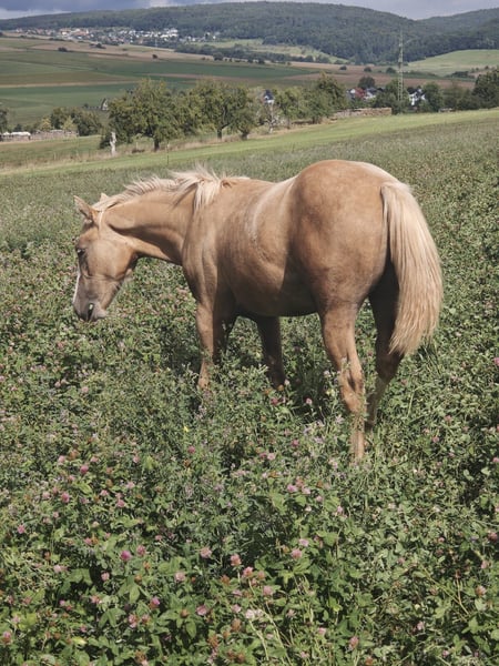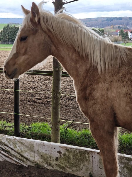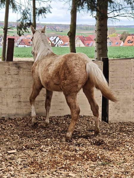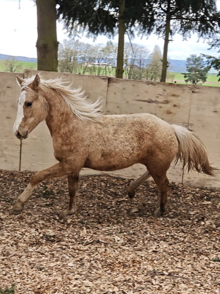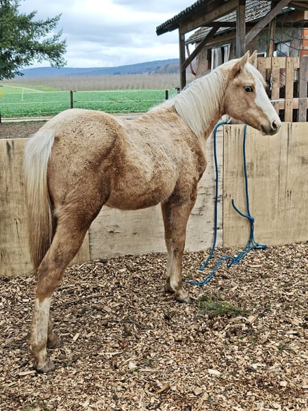 Shining Gun Tari ist eine bildhübsche Quarter Horse Stute, geboren am 04.03.2025, in der Farbe Palomino, mit einem Endmaß von ca. 153 cm. Die AQHA-Papiere liegen vor und genetisch ist sie 5-Panel n/n über die Eltern. Die junge Stute überzeugt durch ein korrektes Gebäude, ein sehr gutes Fundament sowie eine ausgewogene Bemuskelung. Sie ist gesund, geimpft, entwurmt und bestens gepflegt. Aufgewachsen in der Herde und im Offenstall, kennt sie den Umgang mit Tierarzt und Hufschmied und ist halfterführig. Shining Gun Tari bringt einen lieben, neugierigen und menschenbezogenen Charakter mit und zeigt fohlentypisch verspielt ein gelehriges und aufgeschlossenes Temperament. Erste Jungpferde-Disziplin wäre jetzt ideal, um sie weiter zu fördern. Dank ihrer guten Reining-Abstammung (Colonels Smoking Gun, Shining Spark, Frozen Sailor) kann sie später vielseitig eingesetzt werden, sei es als Showpferd oder als Freizeitpartner. Sie wächst unter besten Bedingungen und viel Liebe auf und wird direkt vom Züchter in allerbeste Hände abgegeben. Auch Tausch gegen eine ältere Zuchtstute möglich.
