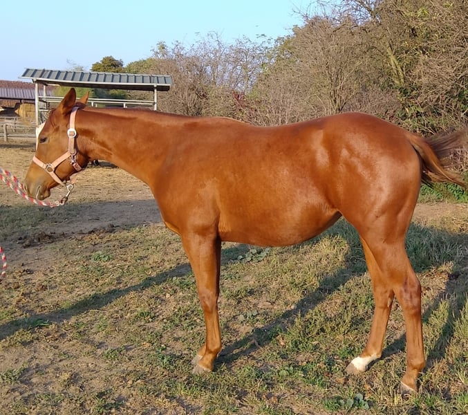 Wir bieten eine wunderschöne 18 Monate alte Quarter Horse-Stute zum Verkauf an. Sie stammt vom hervorragenden Hengst Colonels Dancing Gun ab, einem direkten Nachkommen von Colonels Smoking Gun "Gunner", einem der einflussreichsten Zuchtpferde im Reining weltweit. 🔹 Name: Bambola Dancingun 🔹 Rasse: Quarter Horse 🔹 Alter: 18 Monate 🔹 Geschlecht: Stute 🔹 Abstammung: Tochter von Colonels Dancing Gun – einem anerkannten Zuchtpferd, das im Reining erfolgreich ist. Ihre Nachkommen zeichnen sich durch ausgeglichenes Wesen, Lernbereitschaft und eine harmonische Konformation aus. 🔹 Temperament: Sehr sanft, neugierig und ruhig. 🔹 Soziales Verhalten: Aufgewachsen in einer Herde, was zu einem gelassenen und ausgeglichenen Charakter beigetragen hat. 🔹 Umgang: Gewöhnt an den täglichen Kontakt, auch im Beisein von Erwachsenen und Kindern. Perfekt als Familien- oder Freizeitpferd mit gutem Potenzial für den Sport. 🔹 Gesundheit: Ausgezeichnet. Vollständige tierärztliche Untersuchung und Röntgenaufnahmen verfügbar. Dieses junge Pferd vereint alle gewünschten Qualitäten: ein vorbildliches Wesen, edle Abstammung und eine solide Basis für eine sportliche oder freizeitliche Karriere. Mit den richtigen Händen wird sie sich positiv entwickeln, sei es für Bodenarbeit, Reining oder andere Western-Disziplinen. Besichtigung möglich in Cuneo (Piemont, Italien).