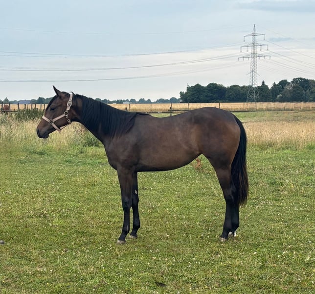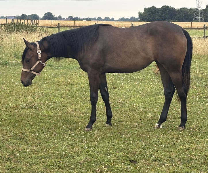 TFR UGOTMEWANTINYOU "Marge" 2024 AQHA dark brown mare by "TFR A Wisely Dream" out of "Hints Littlefoot" by "Undeniably Hint" DQHA Futurity paid in "Marge" is an absolute eye-catcher. She is also very people-oriented and sweet to handle. Her correct conformation, her movement, her look, and her sweet nature make her a promising partner as a future show horse as well as in leisure time. Added to this is her good pedigree, which also makes her very promising for use in breeding in the future. She is easy to lead, good with the farrier, and knows the foal ABC. Her sire "TFR A Wisely Dream," a direct son of "Investing Wisely," is a World and Congress Champion. "TFR A Wisely Dream" was also very successful himself. His successes include multiple Grand Champions, DQHA Regio Champion and Reserve Champion, DQHA International Reserve and Co Reserve Champion. His offspring are breeding show winners up to EWU GO 2022 Best Young Horse Champion, as well as Reserve Champion. Her dam "Hints Littlefoot" is registered in Marebook 1 and is herself a Futurity Champion. The successes of her offspring include European Reserve and multiple Futurity Champions. Her five offspring to date have all been successful in sport. "Hints Littlefoot" descends from the Hall Of Fame and Leading Sire stallion "Undeniably Hint." "Marge" therefore leaves nothing to be desired. Sale on behalf of the client For further information and questions, please feel free to contact us via email at jagfeld@t-online.de or by phone at Alexandra +49-170-2977648 or Hubertus +49-171-3322970.