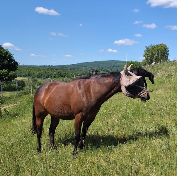 21-letnia klacz quarter horse szuka nowego, odpowiedniego domu! Oddana zostanie za umowę zastępczą, do odpowiedzialnych rąk. Lokalizacja: pomiędzy Koblenz a Simmern w Nadrenii-Palatynacie. Jej towarzyszka niedawno odeszła, a od tego czasu stoi niestety odseparowana obok młodych ogierów, co oczywiście nie jest rozwiązaniem na dłuższą metę. Dlatego z wielką nadzieją poszukujemy dla niej pięknego domu. Jak na swój wiek, jest w świetnej kondycji, ostatnio była użytkowana jedynie na wiosnę i wymaga delikatnego ponownego wprowadzenia do jazdy, aby móc znowu jeździć rekreacyjnie, dostosowując się do swojego wieku. W kontaktach z ludźmi można o niej tylko mówić dobrze. To prawdziwy skarb. Bez problemu można ją obsługiwać przez dzieci. Bardzo spokojna i przyjazna dla ludzi na co dzień. Przyzwyczajona do czyszczenia podkuwek i załadunku. Ma jedno schorzenie: astmę equine. Jednak objawy są kontrolowane i nie występują przy wilgotnym sianiu, sianokiszonkach lub parującym sianie, czyli w mniej pyłowym środowisku.