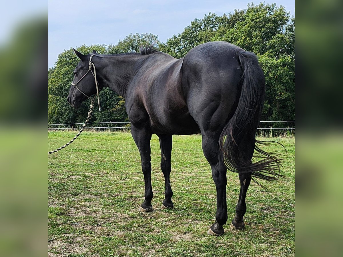 Steelcity Invite ist eine bildhübsche, kompakte und korrekt gebaute Quarter Horse Stute, geboren 2005, in der Farbe Black, mit einem Stockmaß von ca. 154 cm. Sie besitzt einen sehr lieben, sanften und freundlichen Charakter, ist menschenbezogen und im täglichen Umgang äußerst unkompliziert sowie leicht zu händeln. Sie ist halfterführig, kennt die Box mit täglichem Weidegang und steht im mittleren Rang der Herde. Wenn sie alleine ist, neigt sie zum Weben. Aufgrund einer alten Weideverletzung nicht mehr reitbar und wird daher ausschließlich als Zuchtstute mit Schutzvertrag abgegeben. Zähne wurden regelmäßig einmal jährlich kontrolliert, sie ist regelmäßig geimpft und entwurmt und verfügt über eine gute Hufqualität. Genetisch ist sie 4-Panel n/n und GBED n/p. Steelcity Invite wurde früher erfolgreich geshowt und eignet sich bestens für die Zucht. Sie ist eine Tochter von Willy Be Invited. Mütterlicherseits ist sie Zippo Pine Bar gezogen. Auf Wunsch kann sie mit einem Decksprung für 2026 von „Pocochex Shows Heart“ abgegeben werden, wodurch ein garantiert grullo- oder schwarzes Fohlen zu erwarten ist.