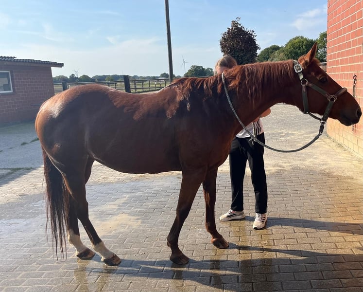 Tinos Fawny – une magnifique, compacte et bien proportionnée jument Quarter Horse née en 2002 (taille environ 149 cm) avec un caractère très particulier. En raison de changements dans sa vie, elle recherche désormais, à contrecoeur, un foyer aimant et définitif auprès de personnes qui lui offriront calme, patience et reconnaissance. Fawny est douce, amicale, très calme et totalement orientée vers l’humain. Elle se montre toujours détendue, cool et résistante au stress dans ses interactions, que ce soit avec le maréchal-ferrant, le vétérinaire ou lors du chargement. Elle connaît la vie en box avec pâturage quotidien et s’épanouit également dans un groupe hétérogène. Son caractère aimable et uncomplicated en fait une partenaire agréable dans toutes les situations quotidiennes. En selle comme à pied, Fawny se laisse facilement et finement guider. Elle est actuellement montée par une jeune fille de 15 ans, avec laquelle elle se montre attentive et motivée. Elle aime travailler à un rythme soutenu et possède de manière naturelle un esprit actif et volontaire, sans devenir nerveuse. Les cavaliers sensibles et subtils apprécieront beaucoup sa réceptivité. En revanche, en raison de sa sensibilité aux aides, elle n’est pas adaptée aux cavaliers débutants ou peu confiants. Fawny a été entraînée de manière polyvalente en tant que cavalière tout-terrain, connaît les exercices de trail et s’engage aussi bien en travail au sol qu’en longe. Elle est totalement sûre en terrain varié et dans le trafic, appréciant aussi bien les sorties tranquilles que le travail ciblé sur le manège. Elle est inscrite dans le stud-book II de la DQHA et a déjà donné naissance à deux poulains primés. Sur le plan de la santé, elle est en excellente forme, à l’exception d’une toux chronique qui ne limite que peu ses activités quotidiennes ou ses séances de monte. Cette jument merveilleuse recherche un foyer aimant où elle pourra continuer à être soutenue tout en ayant simplement le droit d’être un cheval. Elle n’est pas « pour tout le monde », mais celle qui la choisira sera celle qui recherche une connexion profonde avec son cheval et saura apprécier le caractère sensible et sincère d’un équidé authentique.