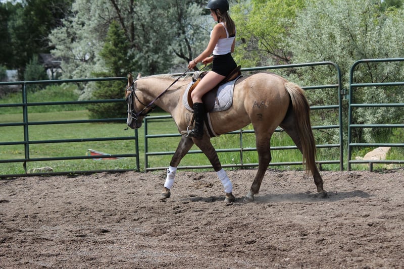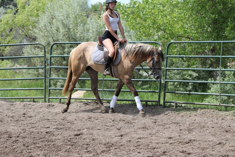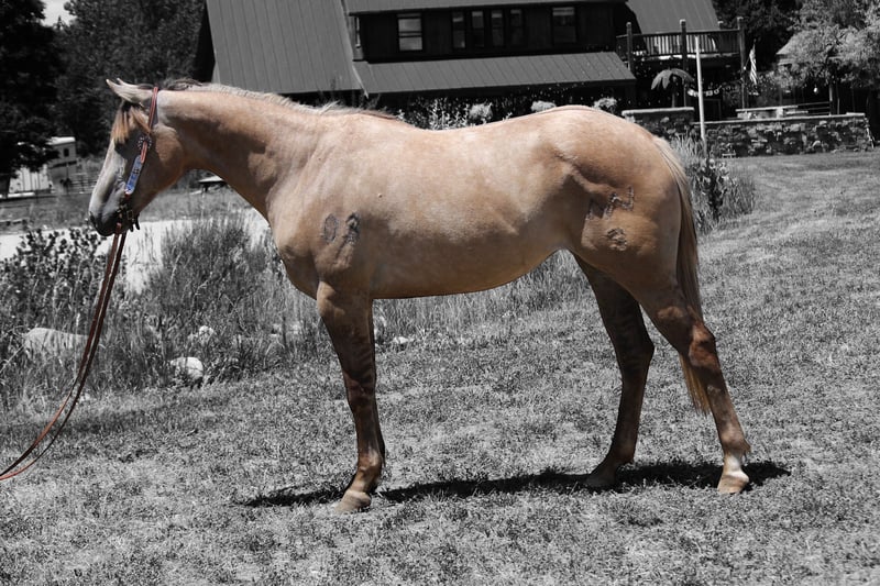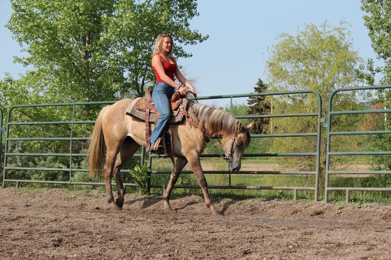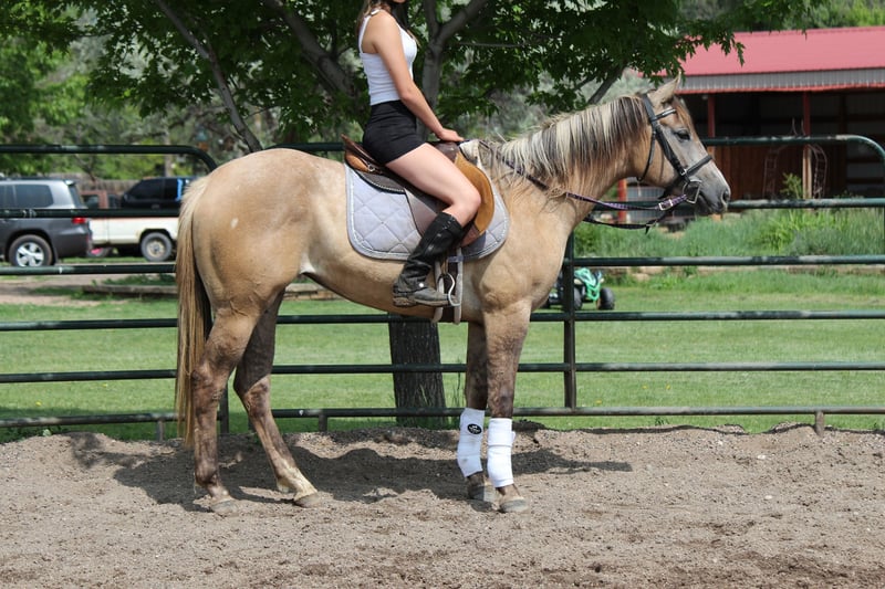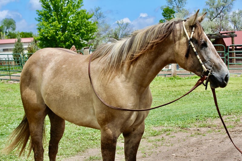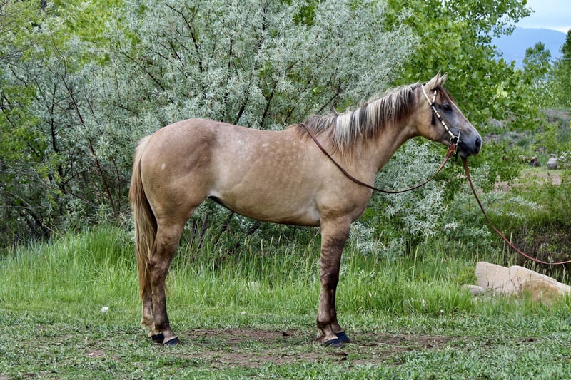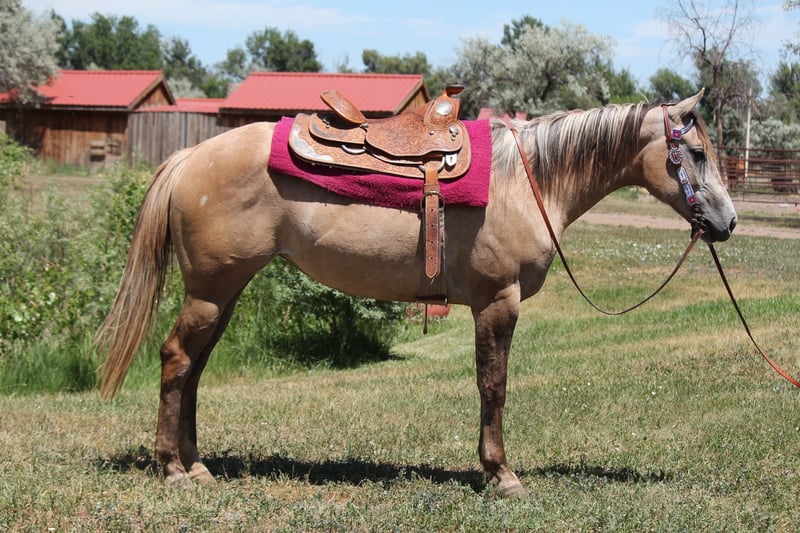 "AVAILABLE ON ONLINE HORSE AUCTION AT www DOT MagicHorseAuction DOT com BIDDING OPEN NOW thru TUESDAY | JULY 22nd - BUY IT NOW AVAILABLE! *Final price will be determined on auction site* CONSIGNOR CONTACT INFO: Dynamite Horses 970-632-3644 LOCATION: Fort Collins, CO MMB PEPPYS MCCUE Aka; Starbucks. Starbucks is an eye catching 15.1 hand blonde dun mare that catches everyone eye! Her absolute brick house build on top of her color, build and extremely sweet and docile-personality makes her the barn favorite! Starbucks has had 30 days western pleasure training, 30 days English and about 15 rides out on the trail- we have even taken her in super heavy and chaotic situations with lots of traffic and chaos and she’s handled it like a champ! Starbucks has beautiful walk, jog, lope transitions with to a to die for smooth jog and lope. She has a quick stop and rollback and is working on her side pass and spins. Starbucks looks incredible in an English saddle, has been worked over the cavaletti and knows where her feet are! Out on the trail she has not second guessed strollers,bikes,runners, traffic etc!! This mare has an incredible foundation for her age on top of a good brain and beautiful coloring and will take anyone to the top whether it’s in the show ring or just taking care of people out on the trail. Give me a call or checkout this super horse! Selling without papers due to a dna error on dams side.