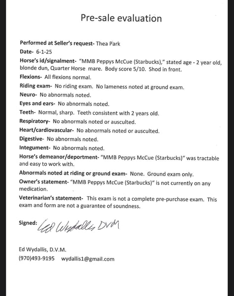 "VERFÜGBAR BEI DER ONLINE-PFERDEAUKTION UNTER www DOT MagicHorseAuction DOT com DIE BIETEN SIND JETZT OFFEN bis DIENSTAG | 22. JULI - SOFORTKAUF VERFÜGBAR! *Der endgültige Preis wird auf der Auktionsseite festgelegt* KONTAKTINFORMATIONEN DES EINLIEFERERS: Dynamite Horses 970-632-3644 STANDORT: Fort Collins, CO MMB PEPPYS MCCUE Aka; Starbucks. Starbucks ist eine auffällige 15,1 Hand große blonde Dun-Stute, die jedem ins Auge fällt! Ihre absolut robuste Statur, kombiniert mit ihrer Farbe, ihrem Bau und ihrer extrem süßen und sanften Persönlichkeit, macht sie zum Lieblingspferd im Stall! Starbucks hat 30 Tage Western Pleasure Training, 30 Tage Englisch und etwa 15 Ausritte im Gelände absolviert - wir haben sie sogar in sehr hektischen und chaotischen Situationen mit viel Verkehr und Lärm getestet, und sie hat das wie eine Meisterin gemeistert! Starbucks hat wunderschöne Übergänge im Schritt, Trab und Galopp mit einem unglaublich sanften Trab und Galopp. Sie hat einen schnellen Halt und Rückwärtsgang und arbeitet an ihrem Seitengang und ihren Spins. Starbucks sieht in einem englischen Sattel unglaublich aus, wurde über Cavaletti gearbeitet und weiß, wo ihre Füße sind! Im Gelände hat sie sich nicht von Kinderwagen, Fahrrädern, Läufern, Verkehr usw. verunsichern lassen!! Diese Stute hat eine unglaubliche Grundlage für ihr Alter, kombiniert mit einem guten Kopf und einer schönen Färbung, und wird jeden an die Spitze bringen, sei es im Turnier oder einfach nur beim Ausreiten. Rufen Sie mich an oder schauen Sie sich dieses super Pferd an! Verkauf ohne Papiere aufgrund eines DNA-Fehlers auf der Seite der Mutter."