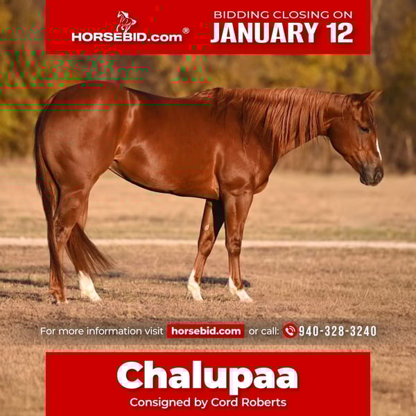 ♦️𝐍𝐄𝐖 𝐘𝐄𝐀𝐑'𝐒 𝑬𝒙𝒕𝒓𝒂𝒗𝒂𝒈𝒂𝒏𝒛𝒂♦️ Happening now thru MONDAY | JANUARY 12th - Available EXCLUSIVELY on HorseBid's website! For more details and to register visit: www.Horsebid.com CONSIGNOR CONTACT: Cord Roberts 940-328-3240 LOCATION: Waco, TX BREED: QH REGISTERED: Yes REGISTERED NAME: CHALUPAA COLOR: Sorrel HEIGHT: 14 AGE: 3 GENDER: Mare