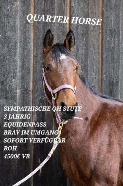 Wird im Auftrag privat verkauft! Hübsche kleine Quarter Horse Stute. Sehr aufgeschlossen, lernwillig und unerschrocken. Kennt Hofleben/ Fohlen ABC. Steht momentan in einer gemischten Herde. Endmaß geschätzt ca. 145cm. Gesund. Regelmäßig geimpft und entwurmt. Die Stute besitzt einen Equidenpass. Kein CoR. Vater: The Mobs Capone Mutter: Pine Starlight Jewel (letztes Bild). Bei weiteren Fragen gerne melden. Privatverkauf. Das Pferd wird unter Ausschluss der Sachmängelhaftung verkauft. Alle Angaben zu Alter, Abstammung, Gesundheitszustand, Nutzung und Verhalten erfolgen nach bestem Wissen, jedoch ohne Garantie und stellen keine zugesicherten Eigenschaften dar. Keine Rücknahme oder Nachverhandlung.