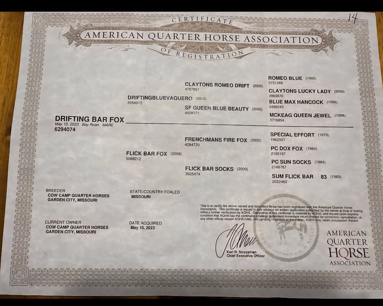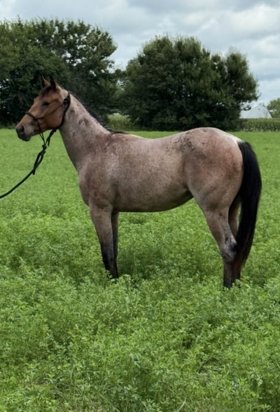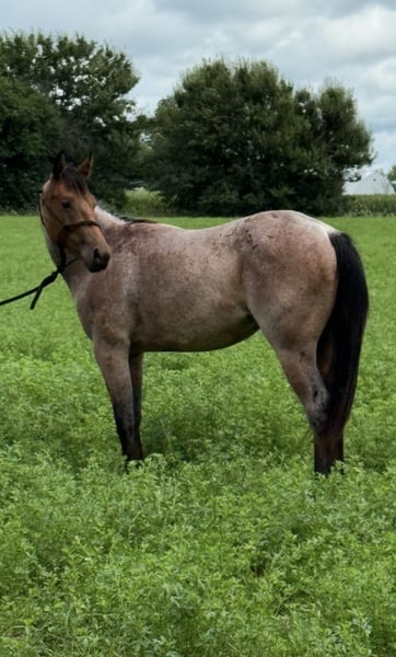 "AVAILABLE ON ONLINE HORSE AUCTION AT www DOT MagicHorseAuction DOT com BIDDING OPEN NOW thru TUESDAY | November 11TH! - BUY IT NOW AVAILABLE! *Final price will be determined on auction site* CONSIGNOR CONTACT INFO: Shauna Cooper 309-229-4249 LOCATION: Princeville, IL This exceptional bay roan filly is the total package: sound, sane, and stunning. Foxy is a registered AQHA 2-year-old with 90 solid days of professional training. She’s hands down the best 2-year-old I’ve ever had the pleasure of owning. Eager to learn, incredibly smart, and retains everything she's taught. She’s been extensively exposed to all kinds of environments and situations, and nothing fazes her: water, mud, logs, tarps, traffic, and more. Foxy crosses it all without hesitation and never gets rattled. Highlights: No scars or blemishes, 14.2 HH at withers - 15.00 HH at hip, Excellent manners: Easy to catch, stands tied quietly at the trailer, picket line, or wall, Sound and healthy, Feet trimmed: October, Teeth floated: July, 5-way vaccine: March, Regular worming schedule, Rides off immediately — no warm-up needed, even with time off, Great in the stall or turned out, Lopes off either lead, and has a great start to neck reining, Truly rides like a seasoned older horse. Foxy is ready to go in any direction — ranch work, trail, performance, or cow work. She’s gentle, level-headed, and absolutely broke beyond her years. Suitable for any rider ready to take her forward. You’ve got to ride her to believe it — come try her out and see for yourself!