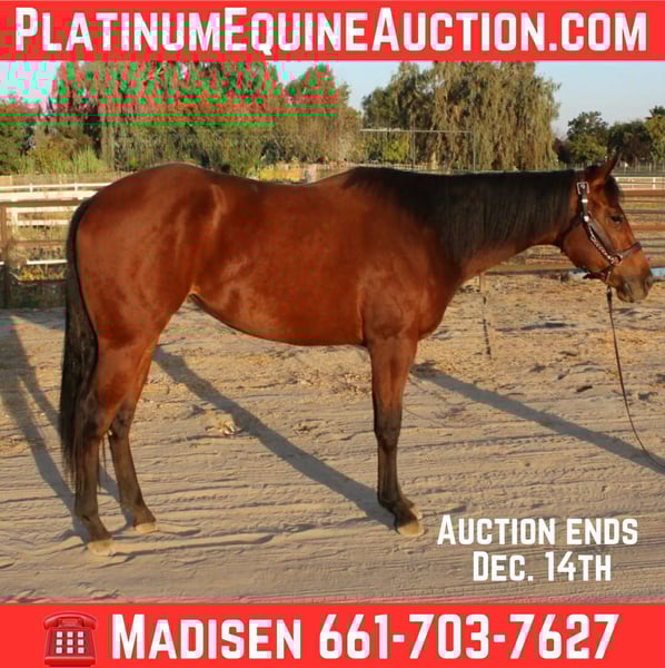 ONLINE AUCTION Place your bids at www.PlatinumEquineAuction.com Starting Bid $3500 Auction ends December 14th, 2025 Need a new saddle? Check out White Rock Saddles on our website or Facebook Remi aka “Ima Hot Outlaw” is a 2023 AQHA, 15hh mare by AQHA World Champion sire Outlaw Enterprise out of a Hot N Blazing mare. At only 2yrs old she’s been started correctly, and can go in any direction! Slow, pretty legged and bred for the show pen, she’s the perfect all around prospect! Or athletic enough for the ranch riding pen, given she has an effortless trot and floaty lope – her options are endless! Remi wants to please and find her ‘person’…she’s been clipped, hauled, UTD on everything, sound and ready to make someone there dream horse. Located in Bakersfield, CA. Contact Madisen Torigiani 661-703-7627 for more info. ONLINE AUCTION Place your bids at www.PlatinumEquineAuction.com Starting Bid $3500 Auction ends December 14th, 2025 Need a new saddle? Check out White Rock Saddles on our website or Facebook