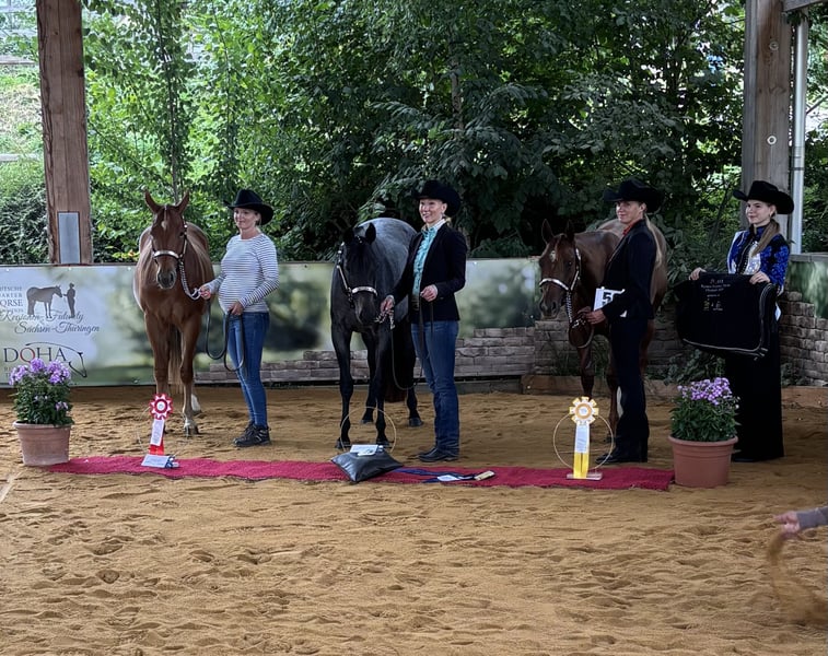 Verkaufe American Quarter Horse Stute – Dunkelfuchs, geb. 2023 Diese wunderschöne zweijährige Stute ist von Unxpected aus einer direkten Blazing Hot Stute. Ihr Endstockmaß wird ca 160 betragen. Sie ist bei mir geboren genauso wie 4 ihrer Halbgeschwister. Alle zeichnen sich aus durch ihren lieben unerschrockenen Charakter und die leichte Trainierbarkeit. Die Geschwister laufen erfolgreich im Sport. Ein Halbbruder ist grade Maturity, DQHA und NSBA Champion Hunter under Saddle auf der Q25 geworden. Phoebe wurde bisher an der Hand trainiert. Sie ist ready to Show in Trail in Hand und Longeline. Im Sommer wurde sie Reserve-Futurity Champion in der Longeline und Co-Reserve Champion im Trail. Sie ist schmiede- und verladefromm, regelmäßig geimpft und entwurmt. Aktuelle Röntgenbilder ohne Befund liegen vor.