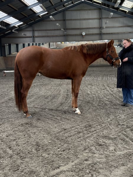 “Andrea,” *Better Call Me Baby*, is a promising AQHA mare born in May 2023 with great potential. She was bred under the DKQHA QSP program and is sired by Good Better Best, whose offspring dominate the hunter classes in the USA. Andrea currently measures approximately 160 cm and is expected to reach a height of around 165 cm. She was purchased at 6 months old and has been handled daily ever since. Andrea is very quick to learn and works well on the lunge, where she already has a solid foundation. In addition, she has begun basic showmanship training, including setup and turns. Backing and preparation for it have not yet been started due to pregnancy. She has been well cared for in every way, including dental care, vaccinations, and farrier visits, and is currently barefoot. Andrea is accustomed to living outside 24/7 during the summer months. In daily handling, Andrea is easy and uncomplicated despite being in her teenage phase. She clearly shows all-around potential, but also has strong breeding potential for hunter classes with her beautiful, long, and expressive gaits. Andrea is only for sale due to lack of time.