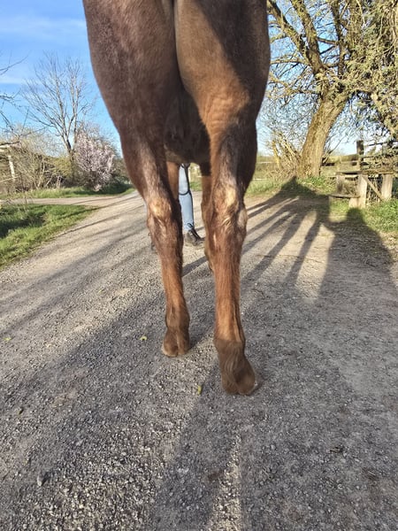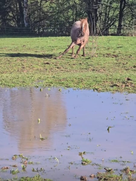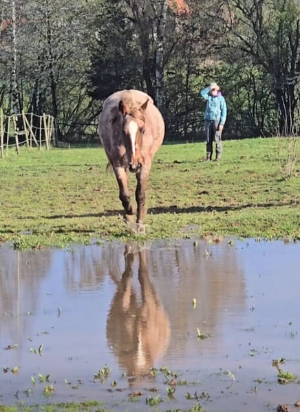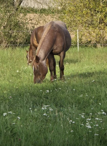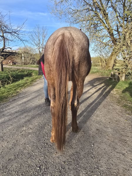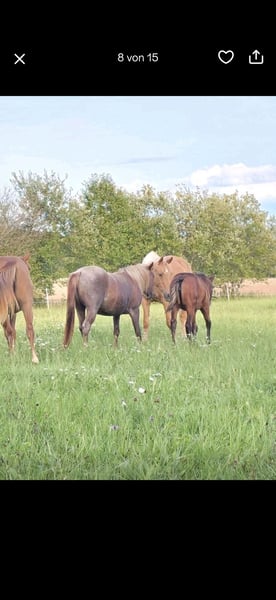 Qualitätsvolle Quarter Horse Nachwuchsstute – mit besonderem Charakter! Mit „El Toptime“ geben wir eine junge Quarter Horse Stute ab, die uns vor allem durch eines überzeugt hat: ihren außergewöhnlichen Charakter. Geboren am 08.06.2022, haben wir sie direkt vom Züchter aus Frankreich geholt und seitdem mit viel Ruhe und Gefühl aufgezogen und vom Boden aus gearbeitet. Sie durfte in ihrem Tempo wachsen und sich entwickeln – genau das spiegelt sich heute in ihrem Wesen wieder. El Toptime ist ein Pferd, das man nicht jeden Tag findet: sehr menschenbezogen, ehrlich und mit einem „Herz aus Gold“. Sie sucht aktiv die Nähe, folgt ihrem Menschen aufmerksam und bleibt auch in neuen Situationen ruhig und gelassen. Abstammung: Woodys Time × Blazing Topsail → solide Grundlage für eine vielseitige Zukunft Auch im Herdenverband zeigt sie sich absolut unkompliziert: Sie kennt sowohl gemischte Gruppen als auch die Haltung in einer Stutenherde (aktuell 7 Pferde) und bewegt sich dort im mittleren Rang. Hier immer im Offenstall gehalten. Eckdaten: ▪️Stute in Red Roan ▪️ca. 1,36 m Stockmaß aktuell leicht überbaut, wächst gerade ▪️5-Panel N/N ▪️bisher nie krank gewesen ▪️kleine Fehlstellung vorne rechts ( keine Einschränkungen) der Huf ist leicht nach außen gestellt. ▪️noch nicht angeritten ▪️kennt es als Handpferd mit ins Gelände zu gehen. Die Entscheidung fällt uns nicht leicht aber wir hatten einfach auf ein paar Zentimeter gehofft – daher suchen wir nun einen passenden Menschen, der genau ein solches Pferd zu schätzen weiß. Wir wünschen uns für Sie das richtige Zuhause, in dem ihr Charakter gesehen wird und sie weiter gefördert wird. Absolut kein Notverkauf!