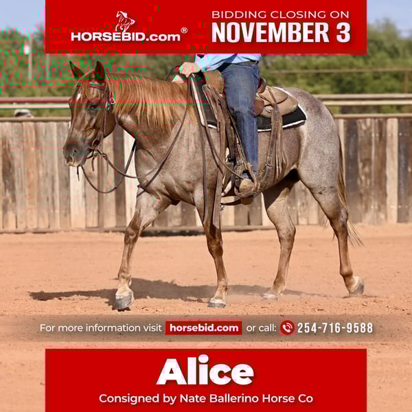 ⚜️𝐓𝐇𝐄 𝐅𝐀𝐋𝐋 𝐇𝐄𝐑𝐈𝐓𝐀𝐆𝐄 𝐂𝐋𝐀𝐒𝐒𝐈𝐂⚜️ Happening now thru MONDAY | NOVEMBER 3rd - Available EXCLUSIVELY on HorseBid's website! For more details and to register visit: www.Horsebid.com CONSIGNOR CONTACT: Nate Ballerino Horse Co 254-716-9588 LOCATION: Waco BREED: AQHA REGISTERED: Yes REGISTERED NAME: CP METALLIC ALICE COLOR: Red Roan HEIGHT: 14.1 AGE: 3 GENDER: Mare 3-Year-Old Mare by Metallic Mallice – Rope Horse Prospect This 3-year-old mare by Metallic Mallice is a standout for anyone looking for a rope horse with talent and a great mind. She’s been started correctly and already knows all the key maneuvers, soft in the face, quick to turn, stops on cue, turns, and travels with balance and ease. She reads cattle well making her a natural to step into the rope pen, or pen on her. Athletic, smart, and eager to learn, she has the foundation to excel in the arena and plenty of ability to grow into a top-level rope horse. She is enrolled in Pink Buckle, Ruby Buckle, Future Fortunes, Breeders Challenge, Colorado Classic, Triple Crown, Royal Crown, and NRCHA Stallion Stakes , giving her top-level opportunities from the start.