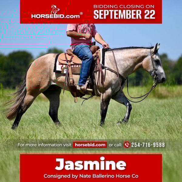 🍁𝒕𝒉𝒆 𝐅𝐀𝐋𝐋 𝑺𝒑𝒆𝒄𝒕𝒂𝒄𝒖𝒍𝒂𝒓🍁 Happening now thru MONDAY | SEPTEMBER 22nd - Available EXCLUSIVELY on HorseBid's website! For more details and to register visit: www.Horsebid.com CONSIGNOR CONTACT: Nate Ballerino Horse Co 254-716-9588 LOCATION: Waco,Tx BREED: QH REGISTERED: Yes REGISTERED NAME: Shady D Deidre Zan COLOR: Gray HEIGHT: 14.2 AGE: 3 GENDER: Mare Jasmine Location Waco,Tx