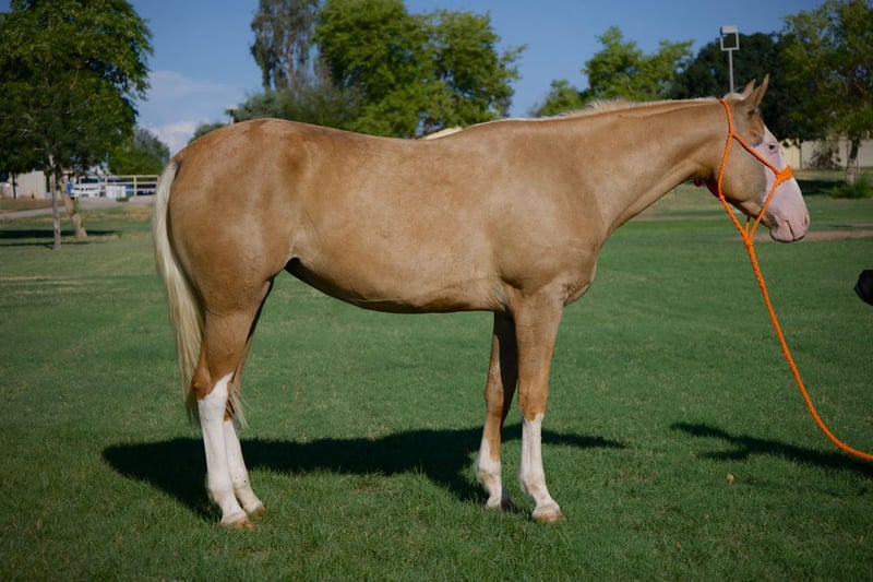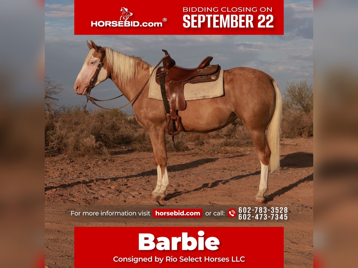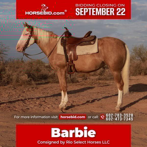🍁𝒕𝒉𝒆 𝐅𝐀𝐋𝐋 𝑺𝒑𝒆𝒄𝒕𝒂𝒄𝒖𝒍𝒂𝒓🍁 Happening now thru MONDAY | SEPTEMBER 22nd - Available EXCLUSIVELY on HorseBid's website! For more details and to register visit: www.Horsebid.com CONSIGNOR CONTACT: Rio Select Horses LLC 602-783-3528 602-473-7345 LOCATION: Tonopah, AZ BREED: Quarter Horse REGISTERED: No COLOR: Baldface Palomina HEIGHT: 14.2 AGE: 3 GENDER: Mare Barbie is a 3 and a half-year-old mare with such a great personality and a loving, kind heart. She has been with us since she was a baby and enjoys the presence of kids. She loves getting groomed and enjoys when kids ride her around the ranch. She has been lightly started since she was two and a half years old , taking our time to give her a good foundation. She has proven to us to be gentle and smart in every way . Barbie has been used for trails ( she rides solo or in groups ). She has also been used by our 9-year-old to sort cattle and do small ranch work. She picks up all four , stands for the farrier, mounting block, loads effortlessly, and travels nicely. She is ready to be anyone’s go-to partner, whether for play, work, or simply dependable family fun. Her willingness shows and proves she is a great prospect for anything you would like her to pursue. Barbie walks, trots, and lopes, catching both leads easily; she rides bareback single or double. You can let her sit, and with confidence, you can always keep going where you left off.