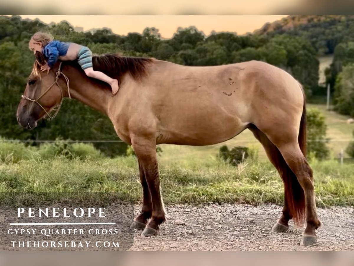 Penelope ist eine wunderschöne Stute, eine 15-Hand hohe Gypsy Vanner Cross, die dunfarbig mit einer Line-Back-Färbung ist. Sie ist äußerst sanftmütig und liebt die Aufmerksamkeit aller um sich herum. Die drei Jahre alte Stute ist ein echter Hingucker und besitzt gleichzeitig viel Verstand – sie hat ihr ganzes Leben noch vor sich. Man kann sie überall auf der Weide einfangen, wenn sie nicht vorher schon zum Tor läuft. Penelope wurde ausgiebig alleine und in großen Gruppen auf Trails geritten. Dabei überwindet sie problemlos alle Hindernisse, die unterwegs auftauchen, sei es Baumstämme, Wasserstellen oder Brücken. Auch vor Wildtieren, die über den Weg springen, hat sie keine Angst. Sie steht hervorragend für Bad, Hufschmied und Pflege. Penelope wäre eine großartige Familien- und Trailpartnerin oder könnte in einem anderen Bereich eingesetzt werden – ich bin mir sicher, dass sie darin sehr erfolgreich wäre.
