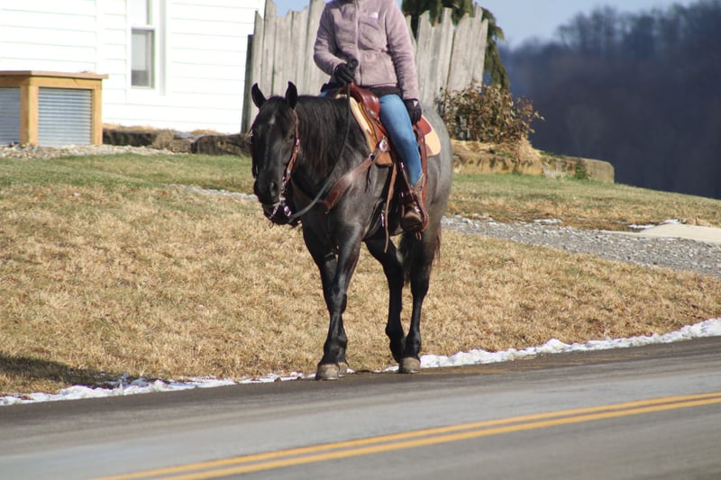 ♦️𝐍𝐄𝐖 𝐘𝐄𝐀𝐑'𝐒 𝑬𝒙𝒕𝒓𝒂𝒗𝒂𝒈𝒂𝒏𝒛𝒂♦️ Happening now thru MONDAY | JANUARY 12th - Available EXCLUSIVELY on HorseBid's website! For more details and to register visit: www.Horsebid.com CONSIGNOR CONTACT: Hershbergers Farm 330-600-0197 LOCATION: Millersburg, OH BREED: Quarter Horse Cross REGISTERED: No REGISTERED NAME: Hershey's Blue Bell COLOR: Blue Roan HEIGHT: 15 AGE: 4 GENDER: Mare Hershey's Blue Bell is a 4 year old Percheron X Quarter Horse mare!! She is very gentle and laid back for her age. "Bell" as we call her most times has been trail ridden a lot and loves to go through water. She is very safe in heavy traffic and doesn't mind the big trucks. Bell picks up both leads and has a nice smooth lope. She stands nice for the farrier and also doesn't mind the clippers. She is easy to catch in the pasture and stands nice to mount. Here is a mare with a lot of future!!! For more info call or text John @ 330-600-0197