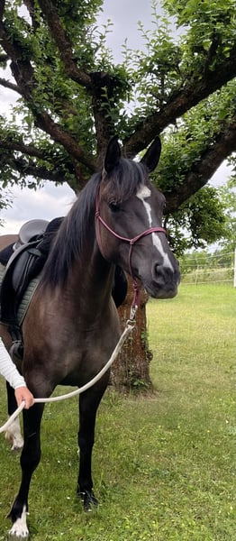 Madonna ist eine 4-jährige Quarter-Horse-Stute OHNE Papiere in der Farbe grullo. Beide Elternteile sind aber bekannt, die Mutter steht ebenfalls bei uns. Die Mutter Evita ist von Cody‘s Fine Girl und Black Cody‘s Jack. Der Vater von Madonna ist TD Im a Magic Chip. Madonna wurde dreijährig angeritten, stand dann über den Winter nochmal auf Koppel und ist seit diesem Jahr im März wieder 2x pro Woche in Arbeit. Sie läuft auf dem Platz alle drei GGA, kennt die üblichen Umgangsregeln, läuft barhuf, war viel im Gelände allein und mit anderen Pferden zusammen spazieren, hat beim Führen und an der Longe auch schon Kinder getragen (da ich therapeutisch arbeite, liegt da einfach der Fokus). Ihre Bewegungen sind absolut sitzbequem, selbst die kleineren Kinder sitzen auf ihr wie auf einem Sofa. Sie ist sowohl western als auch klassisch geritten und kennt und besitzt auch dementsprechend einen Western-sowie einen Dressursattel. Eingeritten wurde sie gebisslos, mittlerweile haben wir sie auch ans Gebiss gewöhnt, was sie gut annimmt. Madonna steht bei uns im Offenstall in einer kleinen gemischten Herde (insgesamt 5 Pferde), sie wünscht sich auch in Zukunft definitiv mindestens einen Spielpartner. Sie ist Hunde gewöhnt und bestens sozialisiert. Hat keine Angst vor großen Fahrzeugen, wie Landmaschinen. Seit Anfang November befindet sie sich nochmal in Beritt, um ihr einfach ein bisschen Routine näherzubringen und sie auch bei schlechtem Wetter vorstellen zu können. Sie ist wirklich ein ganz tolles Pferd, mutig, willig und wunderschön. Sie möchte auch gefallen, ist gern dominant und wünscht sich eine feste Bezugsperson. Hat sie so jemanden gefunden, tut sie alles für denjenigen. Sie hat ihren Menschen verdient und wenn Bedarf besteht, kann auch ihr Sattel mit ausziehen. Sie ist ca 1,55m groß und relativ kompakt. Sie steht in 14913 und bei ernsthaftem Interesse freuen wir uns über direkten Kontakt unter der 015758885560 (Nadine Hackel) Ich beantworte dann gern Fragen per Anruf, Nachricht oder WhatsApp. Auch könnte ich dann noch ein Video vom Anreiten schicken, aktuelle Filme muss ich erst machen. TüV liegt noch nicht vor. Sie war nie krank! Hier fehlt einfach die Zeit, das ist auch der Grund, weshalb wir sie abgeben. Sie wünscht sich schon auch gern die Nummer 1 zu sein. Preis liegt bei 10.000€ und ist bei entsprechendem passenden Menschen auch verhandelbar. Ihr Westernsattel dürfte übernommen werden, wenn gewünscht. Privatverkauf Es gilt der Haftungsausschluss