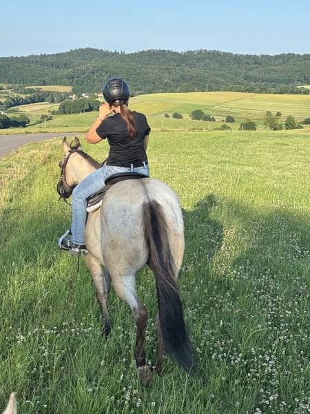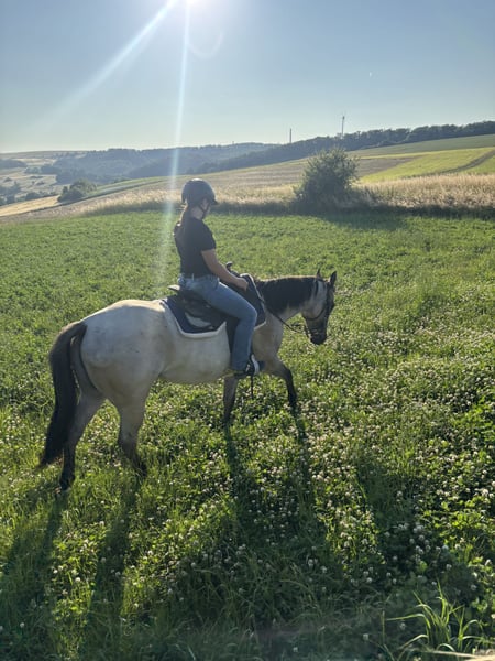 Stute ideal für Wanderreiter Wir suchen für unsere sehr großrahmige Stute (wird ca 1,58) den passenden Partner. Sie wird bereits im Gelände von meiner 18-jährigen Tochter geritten und beherrscht Schritt, Trab und Galopp, nicht perfekt aber der nächste Schritt wäre ein professioneller Beritt. Sie ist wahnsinnig gerne im Gelände und eignet sich absolut für Wanderritte. Mehr können wir noch nicht sagen. Wirwollten sie bereits schon wegstellen in Beritt, aber sie ist zu sehr gewachsen und war stark überbaut. Sie hat sehr schöne weiche Gänge. Sie ist recht ranghoch aber freundlich. Sie ist geimpft, sehr artig beim Schmied, barfuß und regelmäßig entwurmt. Wir hatten sie für meinen Mann gekauft, aber er braucht eher etwas erfahrenes und Jungpferd war nicht die richtige Entscheidung. Sie lebt in einer Gruppe mit acht anderen Pferden und versteht sich sehr gut. Sie lebt im Offenstall.
