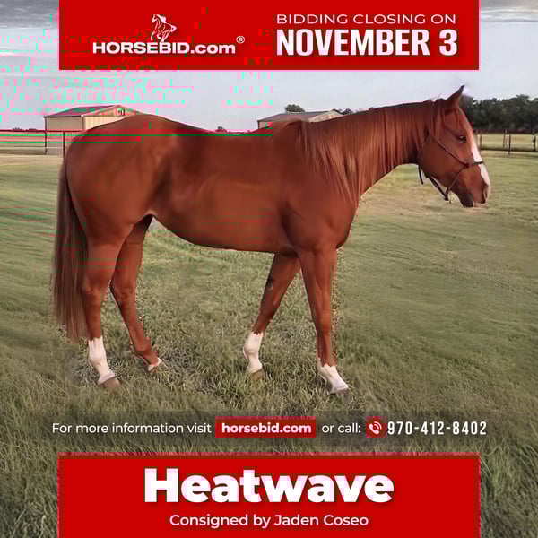 ⚜️𝐓𝐇𝐄 𝐅𝐀𝐋𝐋 𝐇𝐄𝐑𝐈𝐓𝐀𝐆𝐄 𝐂𝐋𝐀𝐒𝐒𝐈𝐂⚜️ Happening now thru MONDAY | NOVEMBER 3rd - Available EXCLUSIVELY on HorseBid's website! For more details and to register visit: www.Horsebid.com CONSIGNOR CONTACT: Jaden Coseo 970-412-8402 LOCATION: Loveland, CO BREED: AQHA REGISTERED: Yes REGISTERED NAME: DASHNHEATWAVE COLOR: Sorrel HEIGHT: 15 AGE: 5 GENDER: Mare DASHNHEATWAVE A 2020 AQHA bred sorrel mare. She is by First Place Eagle (who is by One Famous Eagle - Speed Index of 101 TWO-TIME WORLD CHAMPION SIRE/ THREE-TIME ALL AMERICAN FUTURITY SIRE) and out of a First Down Dash dam. **She is ROYAL CROWN & 5 STATES INCENTIVE ELIGIBLE!!** Heatwave is the one we rely on for ALL things. Whether we are doctoring and gathering cattle, flagging the ropings, breaking in the steers, breaking yearling colts, or going on elk hunts - she is the horse we use! We have ranched over 50,000 acres across northern Colorado in some tough terrain elements. This mare is super strong and willing. She never gets hot minded or panics in any situation you put her in. She has a solid foundation, is very broke to ride around, knows her job on what to do. We have headed and heeled off of her. Ranched on her. Branded on her. She knows the barrels/ this spring was loping a nice pattern. She is as solid as they come!! Can go any direction you please!! You won’t find a horse any better than can do it all. She is super safe. Has never bucked- we’ve saddled her in freezing cold temperatures in Colorado and went up the mountain. She is bred outstanding for breeding success - if that is a route you’d like to take. Just an over all exception to anyone’s program. She has never been sick - she does have a few scars from a yearling that are superficial across her chest/top of front legs area. Nothing more than a few switches. Buyer is more than welcome to have a pre purchase exam done. We have used her hard and she has never became lame. I have X-rays on file to send to someone! She is located in Loveland, CO. Can help arrange shipping to Arizona or Texas! I make trips often. Feel free to give me a call about her!