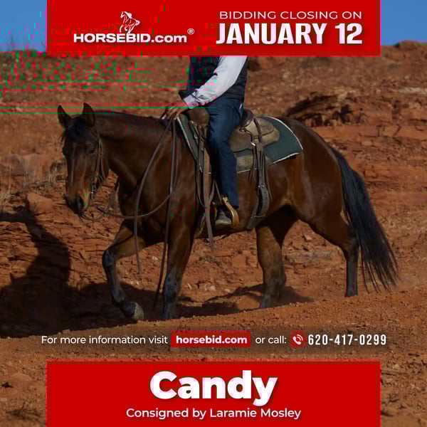 ♦️𝐍𝐄𝐖 𝐘𝐄𝐀𝐑'𝐒 𝑬𝒙𝒕𝒓𝒂𝒗𝒂𝒈𝒂𝒏𝒛𝒂♦️ Happening now thru MONDAY | JANUARY 12th - Available EXCLUSIVELY on HorseBid's website! For more details and to register visit: www.Horsebid.com CONSIGNOR CONTACT: Laramie Mosley 620-417-0299 LOCATION: Canyon TX BREED: QH REGISTERED: Yes REGISTERED NAME: HOOKED ON DRY FIRE COLOR: Bay HEIGHT: 15 AGE: 5 GENDER: Mare Candy is a 5-year-old mare, Hooked On Dry Fire, is by PG Dry Fire and out of a Hooked On Run mare, giving her a powerful combination of speed, grit, and athletic ability. She has tons of natural run and the talent to excel as a head horse or a barrel horse. She is super easy to get along with, gentle, and good minded, making her a pleasure to ride and be around every day. She has a willing attitude, learns easily, and handles new situations with confidence. The kind that stays honest, wants to please, and is straightforward to bring along. She is paid into the Ruby Buckle and eligible for the Riata, adding significant value and opportunity for someone wanting a competitive mare with incentive eligibility. A classy, athletic mare with speed, brains, and proven bloodlines—ready for someone to take her and go win in or out of the arena.