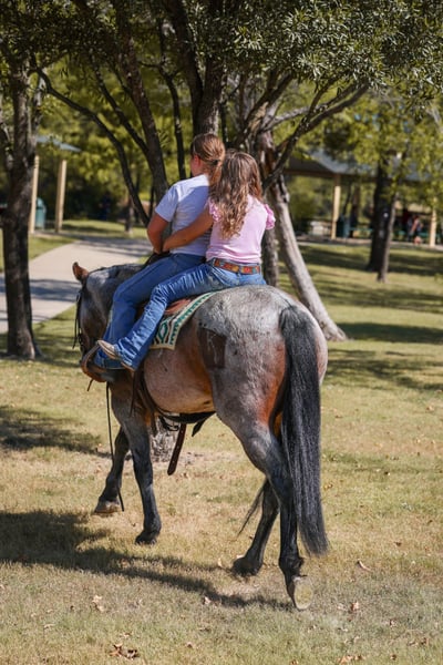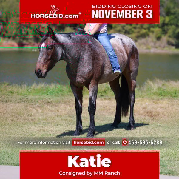 ⚜️𝐓𝐇𝐄 𝐅𝐀𝐋𝐋 𝐇𝐄𝐑𝐈𝐓𝐀𝐆𝐄 𝐂𝐋𝐀𝐒𝐒𝐈𝐂⚜️ Happening now thru MONDAY | NOVEMBER 3rd - Available EXCLUSIVELY on HorseBid's website! For more details and to register visit: www.Horsebid.com CONSIGNOR CONTACT: MM Ranch 469-595-6289 LOCATION: Forney Tx BREED: Quarter Horse REGISTERED: No COLOR: Bay Roan HEIGHT: 14.2 AGE: 5 GENDER: Mare 🌟Unicorn Alert!!🌟 This is Katie, A true one of a kind. She is bay roan or what I call a frosted bay roan color. She is an absolutely GLAMOROUS little mare standing at the perfect size of 14.2 hands tall. A once in a lifetime find and at just 5 yrs old she has her whole life in front of her. She has been vet checked to be 5 yrs old. She was born and raised on the same place. Imprinted and handled since birth. She has the most loving and kind disposition. She is naturally gentle and kind. Doesn’t have a mean bone in her body. Absolutely loves attention from any and everyone. Especially kids!!! Not even an ounce of spookiness. No snootiness or watchiness. Absolutely no bad habits. She is the ultimate sweetheart. Katie has a solid foundation in her training. Since she was 2 yrs old she has been used on a big working ranch. She has all the ability and cow sense. She can go any direction. So talented and smart. And so easy to ride. ✨This girl could stand in place and lope. She is so refined and elegant. Her trot and lope is Effortless for her!! So smooth and easy. You barely have to squeeze to get her to step off in it. She is Fancy!!! Katie has all the bells and whistles as they say!!! She is ready to go on and do big things. She has been rode both in and out of the arena. Rode out on the ranch and checked cattle and been on lots of trail rides. Even had a lot roping done on her and true ranch work done on her. You do not have to be a cowboy to ride her tho. 💥 Cause the best thing about her is she is absolutely safe and gentle for anyone. I have never seen this mare do anything wrong. No bad habits. Absolutely no quirks or vices about her. ⭐️ She stands perfect to be mounted. Stands perfect for baths. She will meet you at the gate every time. And comes right up to you and puts her head in the halter. She loves going to work. She wants to please and wants to learn. Absolutely NO warming her up. Just jump on her and go. She is safe for anyone to ride!!! She really has the capability to do anything you want to do on her. You will get noticed riding her. She is pretty. 🍒 Katie is guaranteed 100% sound in every way. 🌎 We can and will help arrange affordable shipping if needed. She is up to date on all shots and worming. She just had her feet done. She is ready to go to her new home. Call with anymore questions you may have about her.