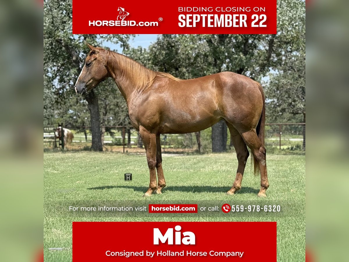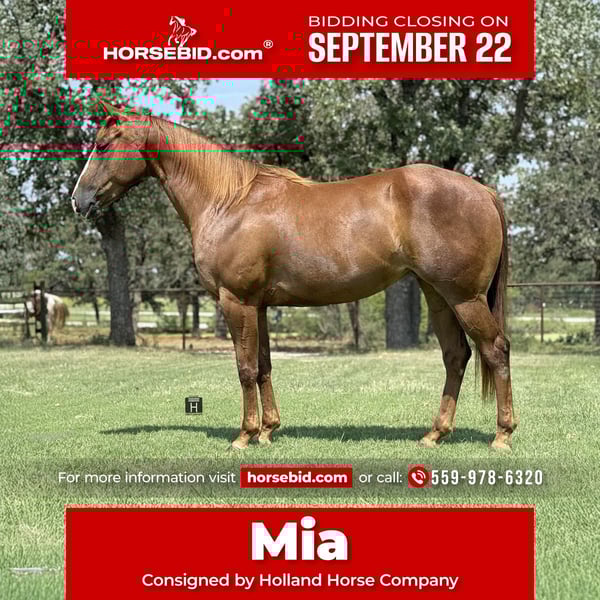 🍁𝒕𝒉𝒆 𝐅𝐀𝐋𝐋 𝑺𝒑𝒆𝒄𝒕𝒂𝒄𝒖𝒍𝒂𝒓🍁 Happening now thru MONDAY | SEPTEMBER 22nd - Available EXCLUSIVELY on HorseBid's website! For more details and to register visit: www.Horsebid.com CONSIGNOR CONTACT: Holland Horse Company 559-978-6320 LOCATION: Jacksboro, TX BREED: AQHA REGISTERED: Yes REGISTERED NAME: Wimpys Royal Chic COLOR: Sorrel HEIGHT: 15 AGE: 5 GENDER: Mare Wimpys Royal Chic aka Mia is a beautifully made, royally bred, and absolutely safe and gentle 5 year old AQHA mare. She is the perfect size standing 15 hands with a ton of bone/muscle to her. Her pedigree includes Wimpys Little Step, Nu Chex To Cash, Smart Chic Olena, and Chics Beduino. She is the perfect cross of cow and run. Mia has an extensive resume of trail riding and being out on the ranch. She has beautiful circles and transitions in the arena. She has a great neck rein on her and is extremely user friendly. Mia is suitable for any and all levels of riders - including youth. She is quiet, gentle, calm and sensible in every single way. Mia takes to new things with ease and has an amazing mind to her. She has the athletic ability to make a fancy performance horse but absolutely loves just going for leisurely rides as well. She is great to be around and is very well mannered. Hauls, ties, shoes, pastures and stalls exceptionally. Mia is sound and straight legged. She is friendly and enjoys attention and going to do things. FMI call/text Chanel with Holland Horse Company 559-978-6320. We are happy to answer any questions, schedule a test ride, or help arrange shipping nationwide!