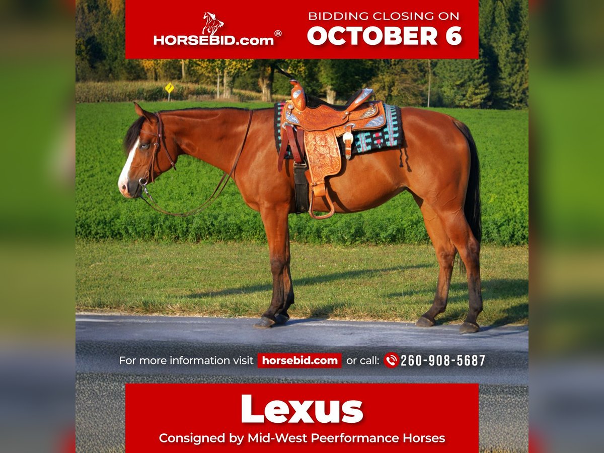 🍂 𝓐𝓾𝓽𝓾𝓶𝓷 𝑨𝑳𝑳 𝑺𝑻𝑨𝑹 𝑳𝑰𝑵𝑬𝑼𝑷 🍂 Happening now thru MONDAY | OCTOBER 6th - Available EXCLUSIVELY on HorseBid's website! For more details and to register visit: www.Horsebid.com CONSIGNOR CONTACT: Mid-West Performance Horses 260-908-5687 LOCATION: Saint Joe, IN BREED: Quarter Horse REGISTERED: No COLOR: Bay/1 blue eye HEIGHT: 15.1 AGE: 5 GENDER: Mare This stunning lady is a 2020 model, Quarter Horse, standing a stout 15.1 hands tall and weighing in at around 1,200 pounds. This mare is absolutely beautiful! Lexus is a flashy mare that has a outstanding disposition and is always willing to please. Dont let her young age fool you, this mare already has alot of training and is ready to go in any direction. Lexus will trail ride out alone or with a large group of people. She will gladly lead the pack, or stay in the back. She goes through water, crosses logs, brush, tall grass, you name it she will go through it. Lexus is 100% TSS and has no vices. Lexus will go up and down any terrain reguardless of the condition. She has been ridden by all ages and skill levels of riders. She has been on lots of trail rides with my 15 year old daughter and her friends and has never failed her! Lexus will ride bareback and double as well. She is ball broke and tarp broke. She will stand tied to a picket line all day and night for over night camping trips. Lexus loves cows and would excel in cow sorting. Lexus has been turnt out with geldings and mares, she gets along with either. She is not sour when going away from the barn, or when she is in heat. She is learning how to side pass and is doing an amazing job thus far. She will stand tied all night long wherever you park her. Lexus has zero bad habits. No paw, kick, or bite, bolt or buck. She does not require shoes as we only have them on her for trail riding in rocky terrian. She requires zero maintenance. Lexus will ride western and English. She lopes right off with the correct lead everytime. She stands perfect for the ferrier and loves to be hosed off. She stands to be clipped, saddled and groomed. Lexus trailers well with no issues. Lexus is always the first to meet you at the gate and is very easy to catch. Lexus has road miles and has even been ridden along the side of a main highway. She always stays confident in any situation that you put her in. She likes to do arena work, and is excelling in pattern work. Please come to the farm and check her out! If you have any further questions or want to set up a Facetime please reach out! I can set up reliable hauling anywhere in the U.S….We would even be willing to haul her ourselves to make sure she arrives to you at her best! Located in Saint Joe, IN For more info contact April with Mid-West Performance Horses 260-908-5687