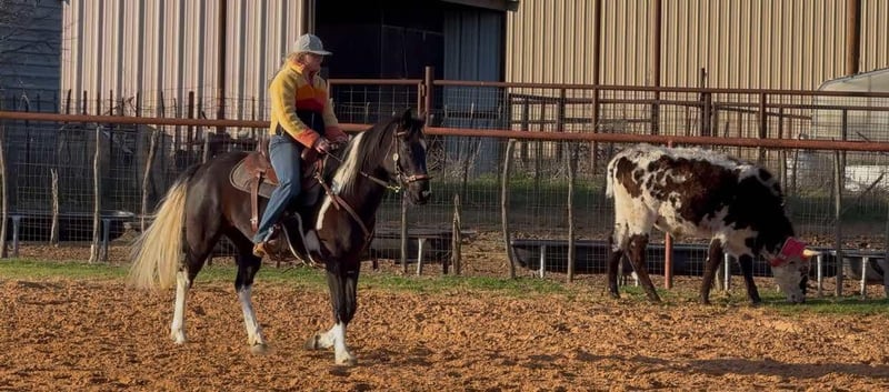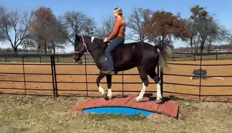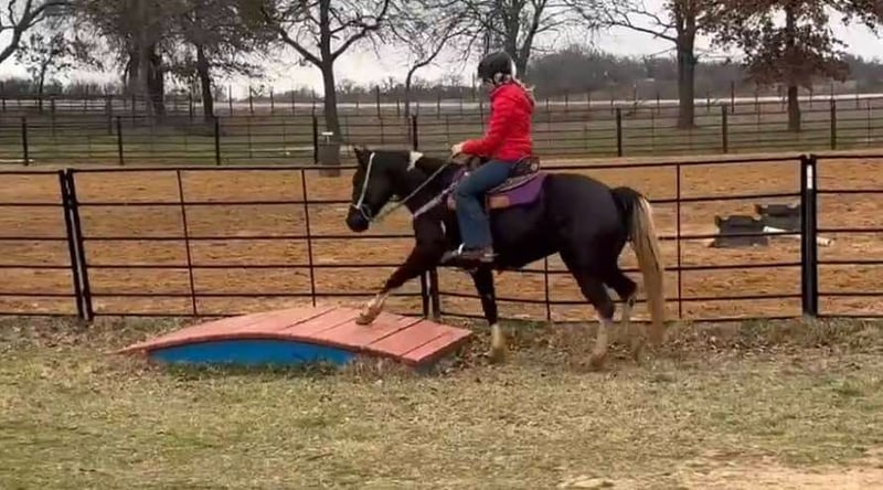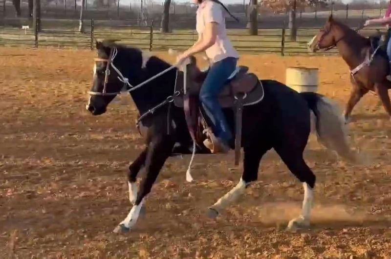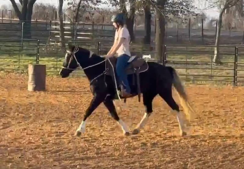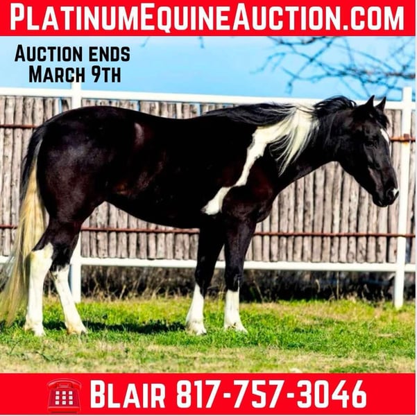 ONLINE AUCTION Place your bids at www.PlatinumEquineAuction.com Starting Bid $3500 Auction ends March 9th, 2025 Need a new saddle? Check out White Rock Saddles on our website or Facebook! Zora is a 14.1H, 5 yr old TRUE black overo paint mare. This GORGEOUS mare has one of the SWEETEST personalities around. She is a super fun, willing to please all around mare! She loves riding outside and also has potential in the arena to go in any direction! She’s been owned by the same people her whole life where they just used her to pleasure ride! Zora is talented enough to go on to make a great youth prospect or trail horse for someone looking for a fun one to enjoy! She rides good, knows all the major basics and is ready to go on with! She walks, trots and lope when asked and stops good! She’s not spooky, no buck, bolt or rear and is easy to get along with! She absolutely loves attention and will be the first one to greet you in the barn or pasture! Zora naturally takes to all new things and is very bravely adventurous. She is safe and gentle, loads, leads and bathes great! She would be the perfect addition to any family looking for a fun one to go one with in any discipline! She’ll go all day without a complaint! Don’t miss this sweet, fun, willing to please STUNNING black and white mare. They don’t come around colored like her often with her personality and potential! More pics and videos on her website page at northtexashorsecompany.com/zora. Please call Blair with North Texas Horse Company for more info at 817-757-3046. We are located in Weatherford, TX and can help arrange affordable shipping to anyone!! ONLINE AUCTION Place your bids at www.PlatinumEquineAuction.com Starting Bid $3500 Auction ends March 9th, 2025 Need a new saddle? Check out White Rock Saddles on our website or Facebook!