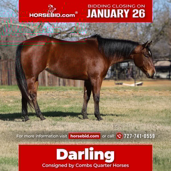𝐉𝐀𝐍𝐔𝐀𝐑𝐘 ⭐️𝑨𝒍𝒍 𝑺𝒕𝒂𝒓 𝑳𝒊𝒏𝒆𝒖𝒑⭐️ Happening now thru MONDAY | JANUARY 26th - Available EXCLUSIVELY on HorseBid's website! For more details and to register visit: www.Horsebid.com CONSIGNOR CONTACT: Combs Quarter Horses 727-741-0559 LOCATION: Cleburne, TX BREED: AQHA REGISTERED: Yes REGISTERED NAME: HelloYouLazyDoll aka Darling COLOR: Bay HEIGHT: 14.2 AGE: 7 GENDER: Mare Perfect tried and true all around mare with the most sensible, go with the flow kind of attitude! HelloYouLazyDoll (Lazy Loper x Sweet Invite) “Darling” is the cutest 7yr old 14.2h bay mare by the one and only superior western pleasure and leading producing stallion, Lazy Loper! This girl is the best of both worlds! She’s got the top of the line pedigree, phenomenal flat movement all packed into the best easy on, easy off size you could ask for! DISPOSITION: Darling is a very sweet mare that’s very easy to get along with. She is easy to catch and very easy to handle. She will stand all day for washing and grooming and loves cookies! She’s a very “old soul” type of girl that we love!! Darling is very suitable for all ages and all sizes. I wouldn’t hesitate to say she would be a great fit for a family, a lesson program or even a first horse. She’s very forgiving with a more push style type of ride. WESTERN EXPERIENCE: Darling was started as a ranch rider. She’s got all the buttons and knows what to do when she’s asked. She moves very well off of your seat and she’s is responsive to your leg without being overly sensitive or responsive making her suitable for the less experienced riders as well. Darlings main job so far has actually been trail riding. She will go over, under and through anything you point her nose at. She doesn’t mind water, ditches, logs, wildlife, traffic… you name it.. she’s very go with the flow and even tempered. Rides quietly with a level headset and a loose rein. She’s a kick back and enjoy the ride kind of girl for sure! ENGLISH EXPERIENCE: Darling is just starting her English career and seems to really enjoy it. She’s got the most perfect little trot that’s very easy to post to and she’s taking right to the jumping. Darling has a bright future in the hunter ring if you decide to go that route with her! With her floaty trot and flat canter.. she will be one to watch for in the flat classes for sure! UPKEEP: Darling is a very easy keeper. She eats free choice alfalfa with just 1/2 scoop of a basic pellet. No supplements or maintenance required to keep this girl sound! She is UTD on everything and wearing just a basic front shoe as a personal preference. TURNOUT: Darling is currently stalled part of the day and turned out with a mixed herd for the other part of the day. She’s very quiet and minds her business. GROUND MANNERS: Darling has great ground manners. She can be lead around by even the little kiddos. She’s very respectful of your personal space. Stands great for washing, grooming, saddling, bridling and mounting! She also stands single tied and cross-tied. BAD HABITS/VICES: Darling has no real bad habits or vices. She will occasionally make a mean face but she’s never made any mean moves. No bite, kick, buck, rear or bolt. TACK: Darling rides English, western or bareback. She will ride in a halter and lead rope, a plain snaffle or even just a short shank snaffle.