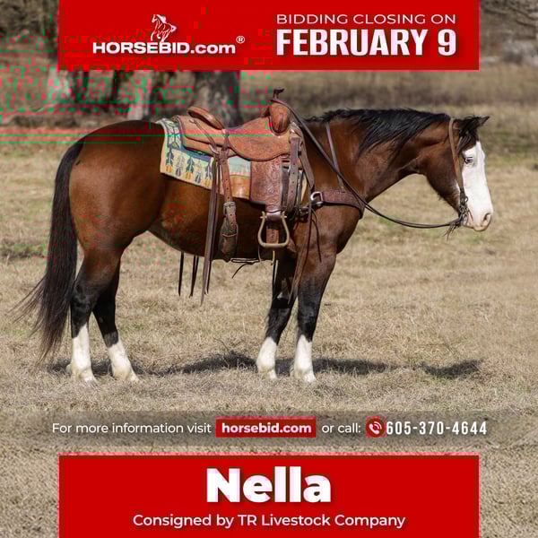 ❤️🔥𝑩𝒆 𝑴𝒊𝒏𝒆 𝐒𝐄𝐋𝐄𝐂𝐓❤️🔥 Happening now thru MONDAY | FEBRUARY 9th - Available EXCLUSIVELY on HorseBid's website! For more details and to register visit: www.Horsebid.com CONSIGNOR CONTACT: TR Livestock Company 605-370-4644 LOCATION: Rusk, TX BREED: AQHA REGISTERED: Yes REGISTERED NAME: Nella COLOR: Bay HEIGHT: 14.3 AGE: 7 GENDER: Mare - [ ] Nella is a 7 year old AQHA bay mare, she stands 14.3 hands tall and is stout! Nella is a finished Reiner and is smooth in all her maneuvers, great spins, big stop, and correct lead changes! She has a super nice short lope, is soft in the face and has a willing attitude. She has also done all aspects of ranch work, from doctoring cattle outside to gathering and sorting in the pens! Nella is absolutely gentle and safe for the entire family and will take care of whoever gets on her! Nella has also been trail rode all over, hauled to lots of state parks and has been on overnight camping trips, she will cross the creeks, logs, bridges and is a point and go type of horse. Super sweet mare that is safe and very broke! Take her to the playdays, show her in the reining, ranch riding and ranch versatility, use her on the ranch, or just trail ride her, you are sure to love this little mare! Call or text 605-370-4644 for more info. She is located in Rusk TX, nationwide shipping is available!