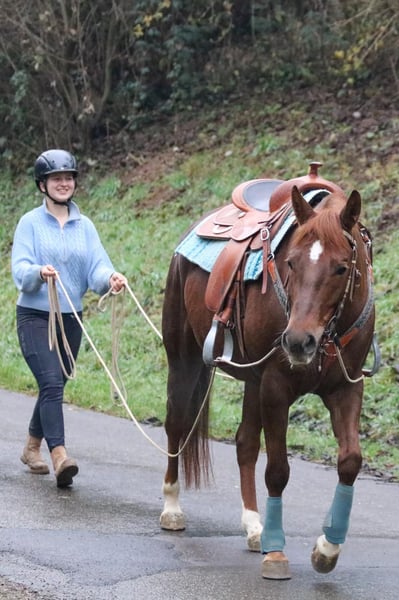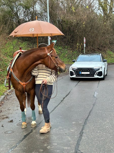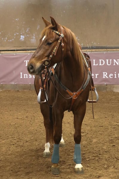 Quarter Horse Stute Amy – 6 Jahre Amy ist eine wunderschöne, sehr elegante Quarter-Horse-Stute, die uns jeden Tag aufs Neue begeistert. Sie ist nicht nur optisch etwas ganz Besonderes, sondern bringt auch eine hervorragende Abstammung mit. Mit einem Stockmaß von ca. 151 cm ist Amy eine sehr elegante, harmonisch gebaute Stute. Ihre außergewöhnliche Fellfarbe, ihr feines, ausdrucksstarkes Köpfchen und ihre schönen Bewegungen machen sie zu einem echten Hingucker. Was Amy jedoch wirklich einzigartig macht, ist ihr Charakter. Sie ist sensibel, feinfühlig und sehr menschenbezogen. Amy sucht die Nähe zu „ihrem“ Menschen, ist anhänglich und aufmerksam. Gleichzeitig braucht sie eine wirklich erfahrene Bezugsperson, die ihr Zeit gibt, sie versteht und sie in Ruhe wachsen lässt. Hat sie einmal Vertrauen gefasst, schenkt sie ihrem Menschen ihr ganzes Herz. In ihrer bisherigen Ausbildung wurde viel Wert auf Ruhe, Vertrauen und eine gute Basis gelegt. Amy kennt: • klassische Handarbeit • Bodenarbeit • Körpersprachenlongieren • die klassische sowie die gefahrene Doppellonge • sie geht brav als Handpferd mit ins Gelände • mit dem Gelassenheitstraining wurde bereits begonnen und das Verladen kennst sie auch • sie ist an Sattel und Trense gewöhnt • das Reitergewicht kennt sie bereits im Stand Amy bringt alles mit, um sich in den richtigen Händen zu einer wundervollen Partnerin zu entwickeln. Ihre Anlagen und ihre Abstammung lassen viel Potenzial erkennen, ganz wie bei ihren Eltern und Großeltern. Dennoch wünschen wir uns für sie keinen schnellen Weg, sondern einen Menschen mit Geduld, Erfahrung und Herz, der Freude daran hat, sie weiter auszubilden und wachsen zu sehen. Selbstverständlich ist Amy scheckheftgepflegt, regelmäßig beim Schmied sowie schmied- und verladefromm. Amy ist kein Anfängerpferd, sondern eine junge Stute mit Persönlichkeit, Gefühl und ganz viel Potenzial. Wir wünschen uns für sie ein liebevolles Zuhause, in dem sie ankommen darf und ihren Menschen fürs Leben findet. Certificate of registration der American Quarter Horse Association liegt vor. Weitere Infos telefonisch unter: 0172 - 4807827