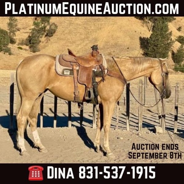 ONLINE AUCTION Place your bids at www.PlatinumEquineAuction.com Starting Bid $3500 Auction ends September 8th, 2024 Need a new saddle? Check out White Rock Saddles on our website or Facebook! A Precious Topaz, here is rare opportunity! Precious is a 2019 AQHA mare standing 15.1. She is by the great Jessie Tooaz who stands at the 6666 ranch. His foals are eligible for Royal Crown Incentives, Gold Buckle Futurities, Riata, Ruby, and Pink buckle, Future Fortunes, Select Stallion Stakes, and NRCHA Stallion stakes. His Sire, MR JESS PERRY SI 113. AQHA Hall of Fame winning himself $687,184, his foal crop has over 1,028 winners, earning $62,290,287. The AQHA #3 All-Time Living Sire of Money-Earners. His Maternal Grandsire PADDYS TOPAZ is sired by PADDYS IRISH WHISKEY, NCHA earner of $12,149. An NRCHA All-Time Leading Sire, siring earners of $1,600,000. Precious was started as a three year old and then sent out to pasture to mature. She has been brought back and is doing great. Precious really has the demeanor to go in many directions. She is the perfect cow/run cross everyone is looking to get! They’re even harder to find with this calm mindset and personable deamor. She lopes both directions, wants to give to all pressure each way, has sliding stop and light in the bridle. She had the most correct start and the talent to go any direction you would like to take her. If you want barrel horse or any type of performance horse that has a calm and quiet mind this is her. She is eager to learn new things and is very smart, she picks up things easy and retains what you show her. She has the brain of a champion doesn’t forget anything, and wants to please you with each time you take her out.I would say she could be ridden by novice riders who have guidance, she is trustworthy and has a great slow pace! She has zero issues and handles long periods of time off. Precious is truly a diamond in the rough and will shine no matter which direction she is taken. Please contact Longhorn Ranch Dina 831-537-1915 located in Paicines, CA with any question or to schedule an appointment to come meet Precious. ONLINE AUCTION Place your bids at www.PlatinumEquineAuction.com Starting Bid $3500 Auction ends September 8th, 2024 Need a new saddle? Check out White Rock Saddles on our website or Facebook!