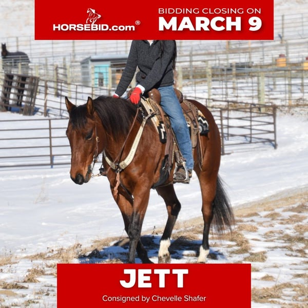 ℳ𝒶𝓇𝒸𝒽 ♦️𝐑𝐈𝐃𝐄𝐑'𝐒 𝐂𝐇𝐎𝐈𝐂𝐄♦️ Happening now thru MONDAY | MARCH 9th - Available EXCLUSIVELY on HorseBid's website! For more details and to register visit: www.Horsebid.com CONSIGNOR CONTACT: Chevelle Shafer 320-296-4308 LOCATION: Glencoe, MN BREED: Quarter Horse REGISTERED: Yes REGISTERED NAME: Jets Hot Effort COLOR: Bay HEIGHT: 15.3 AGE: 7 GENDER: Mare 2019 AQHA bay mare Jett is a 7 year old mare standing 15.3hh with a great mind, solid foundation and consistency in every ride. She is easy to look at and fall in love with her kind eyes, big solid hip and shoulder and 4 solid feet, rides off barefoot and sound. She truly enjoys being outside or in open spaces whether it’s a trail ride or a job around the farm, rope off of her, pull the kids around, let her join in on family fun. Out on the trail she has crossed rivers, up and down steep hills, over bridges and logs and trudged through the thick woods and rough terrain. She approaches her work and any obstacle calmly and is happy to do whatever job is put in front of her. With dogs, atvs, farm equipment being a normal for her. She is easy to handle and quiet in the ground, loads herself in the trailer, stands tied to the trailer all day, stands quietly for bathing, and is cooperative and patient for the farrier. With zero buck, kick, rear or bite. She will walk, trot, or lope off, in or out of the arena on a nice loose rein, while staying soft in her face. Moves beautiful with a smooth trot and nice stop. She is easy to catch out in the pasture and loves attention from anyone that will give it to her!