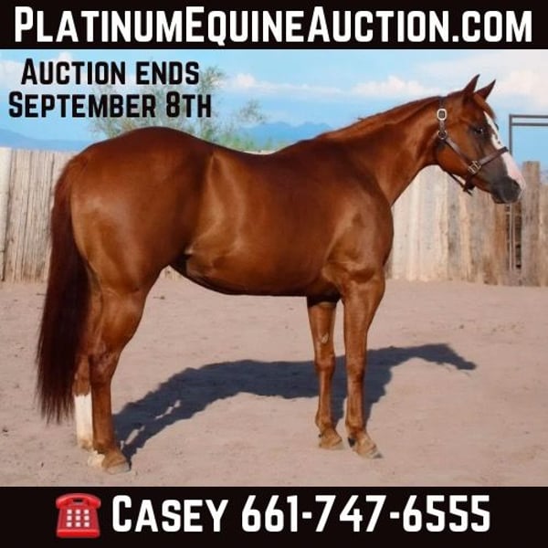 ONLINE AUCTION Place your bids at www.PlatinumEquineAuction.com Starting Bid $3500 Auction ends September 8th, 2024 Need a new saddle? Check out White Rock Saddles on our website or Facebook! Rockin In The Smoke aka “Fiona” is a cute 6 yr old AQHA mare. She stands 14-14.1 hands tall and is stout built. She is a GREEN horse with about 60 rides on her. She is willing and athletic and would make a strong prospect for multiple different disciplines. She has been hauled, exposed to different places, and rode outside. She has handled it all extremely well and with an eager attitude. Extremely smooth ride with a low headset, Fiona is quite the pleasure to cruise around or to spend time training on. Located in Scottsdale, AZ. If you have any questions feel free to call Cardon Livestock Casey 661-747-6555. ONLINE AUCTION Place your bids at www.PlatinumEquineAuction.com Starting Bid $3500 Auction ends September 8th, 2024 Need a new saddle? Check out White Rock Saddles on our website or Facebook!