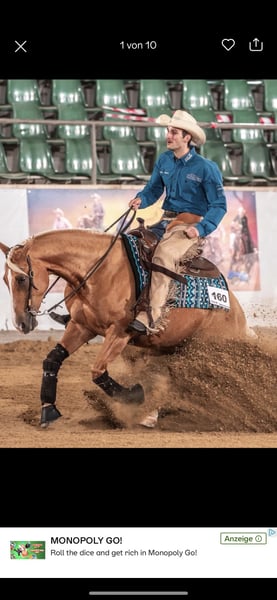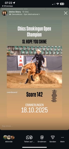 Ich verkaufe meine 8 jährige Quarter Horse Stute. Sie ist top ausgebildet und ist aktuell im Profiberitt bei Sven Bösl. Von ihm wurde sie auch erfolgreich im Reining geshowed. Videos auf Anfrage. Ihr Stopp ist Mega. Charakterlich ist sie einwandfrei und lieb und verkuschelt, Sie hat ein tolles Papier und ist für die Zucht sehr interessant. Sie eignet sich als Sportpferd aber auch sehr gut für Freizeitreiter. Ich möchte für sie einen super Platz. Platz geht vor Preis. Verkauft wird sie aufgrund von Bestandsreduktion. Probereiten ist möglich in Kirchdorf bei Haag auf der Blue spirit Ranch. 30 min von München. 8 jährige QH Stute von Shine Chic Shine x Topsail Whiz 2025 Breeders Derby Open Finalist 2025 Bavarian Slide Saddle Trophy Score 141,5 2025 Bavarian Slide Chicks Smokin Gun Open Champion Score 142 Interessant für Sport, Freizeit und Zucht