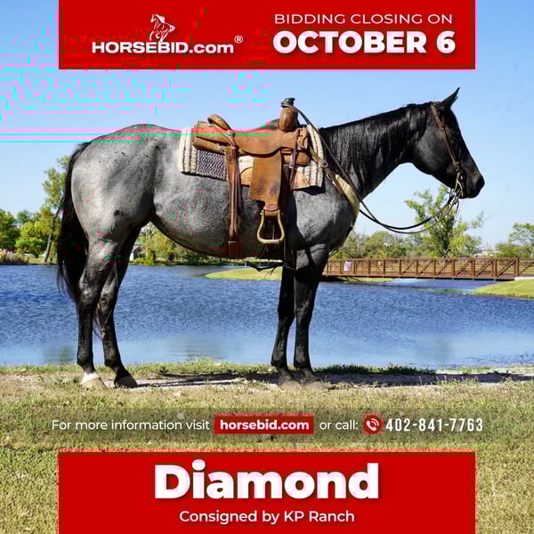 🍂 𝓐𝓾𝓽𝓾𝓶𝓷 𝑨𝑳𝑳 𝑺𝑻𝑨𝑹 𝑳𝑰𝑵𝑬𝑼𝑷 🍂 Happening now thru MONDAY | OCTOBER 6th - Available EXCLUSIVELY on HorseBid's website! For more details and to register visit: www.Horsebid.com CONSIGNOR CONTACT: Kp Ranch 4028417763 LOCATION: Corsica SD BREED: Quarter horse REGISTERED: No COLOR: Blue roan HEIGHT: 15.2 AGE: 8 GENDER: Mare Diamond is an eye catching true blue roan mare, she is prime aged and beautifully made. She has been used for pleasure classes and trail and leisure to riding around the farm, Lopes as slow as a walk and smooth as can be, this mare is so fun and enjoyable to ride and have around, super easy going personality. A great all around mare. Good to catch, good for farrier, loads/unloads/hauls great. A super nice mare for anyone to enjoy. Call or text for more information 402-841-7763