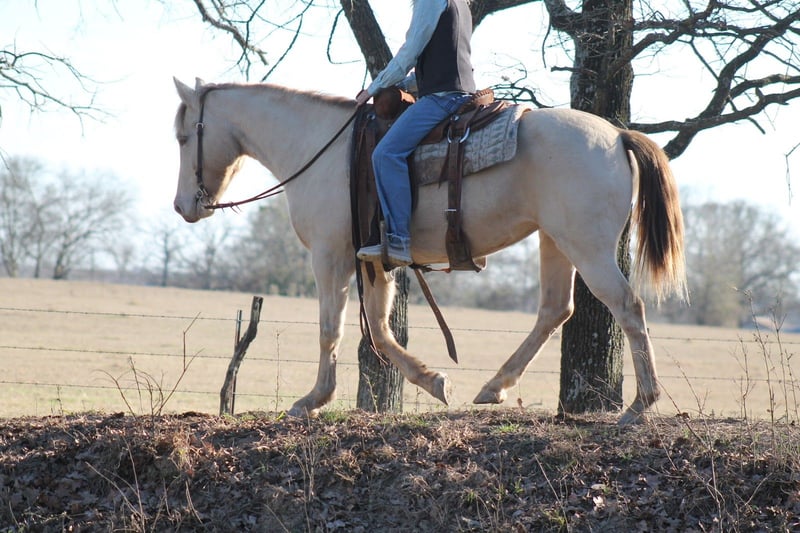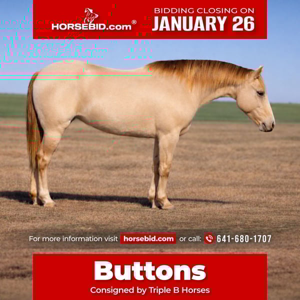 𝐉𝐀𝐍𝐔𝐀𝐑𝐘 ⭐️𝑨𝒍𝒍 𝑺𝒕𝒂𝒓 𝑳𝒊𝒏𝒆𝒖𝒑⭐️ Happening now thru MONDAY | JANUARY 26th - Available EXCLUSIVELY on HorseBid's website! For more details and to register visit: www.Horsebid.com CONSIGNOR CONTACT: Triple B Horses 641-680-1707 LOCATION: Plane, IA BREED: QH REGISTERED: No REGISTERED NAME: Buttons COLOR: Champagne HEIGHT: 14.2 AGE: 9 GENDER: Mare -Family Horse- Buttons is a grade 9 year old mare standing 14.2 hands tall. If you haven’t guessed it already by her photos she is just as cute as a button with a unique champagne color that will have everyone talking about her! Buttons has been rode by kids, approved by mom, and even received the okay from grandma! She is safe, safe, safe! This mare is another one we are very honored to offer and look forward to finding her perfect family! She has been there done that. Riding down the trails, through town, at the play days, and even helped move some cattle. There isn’t a single job you could offer this mare that she would refuse. She is not buddy or barn sour- meets you at the gate ready for the day! She is easy to tack up, stands tied quietly, loads and unloads with no issues, good for the farrier and the vet. Up steep hills, through deep water, or over tall logs Buttons takes her time to ensure her riders safety. She has been hauled to several horse parks and is the same horse no matter the environment around her. Buttons will walk, trot, lope with ease. An easy stop and backs when asked. Buttons is also the type of horse you can leave off for months- go catch her with a halter-hope on bareback and lope off across the pasture without a single fuss. She has zero buck, bite, rear, or kick! Buttons has also has very good ground manners. She is not pushy, loves attention but still respects your space. She has been exposed to all sorts of silly things and not once offered to spook. This is a well minded non-marish mare with a unique color that your kids will love! Buttons has never taken a lame step, she does not crib or weave. She has no past health issues. Buttons does have a small spot on her right eye-we believed it happened eating from the hay bale- it was seen by a vet and she still has full vision in that eye- it is only a scar.