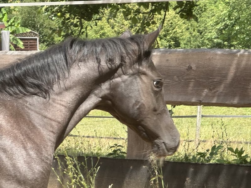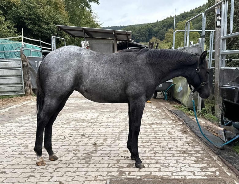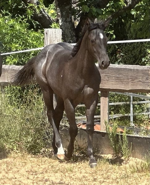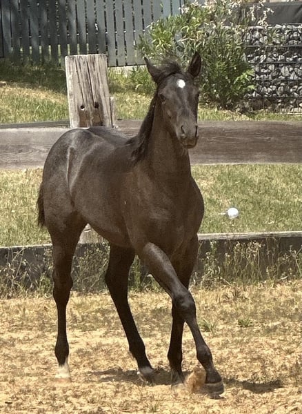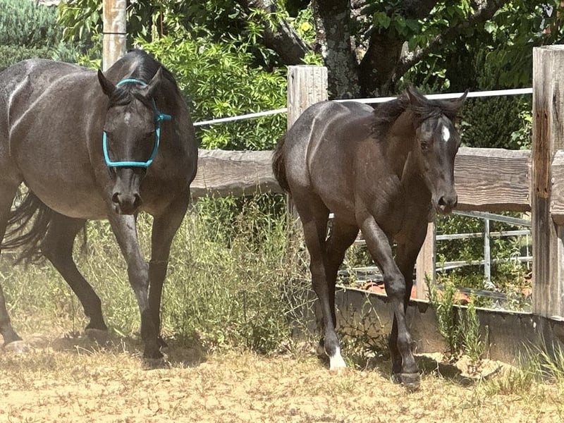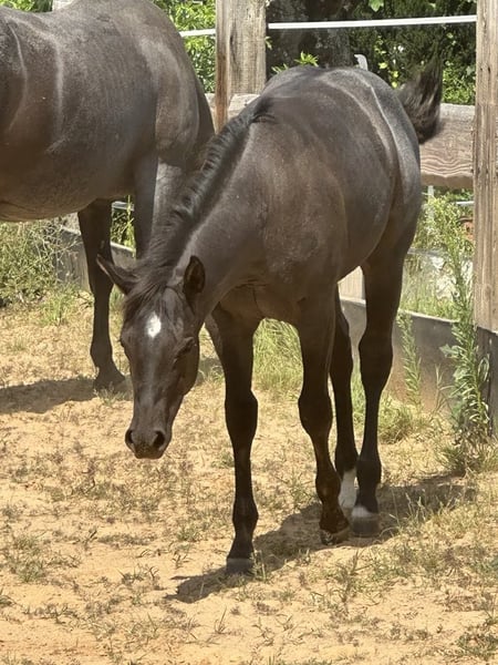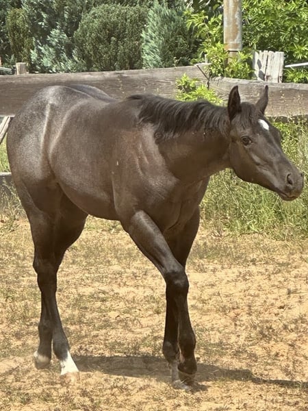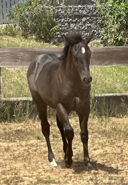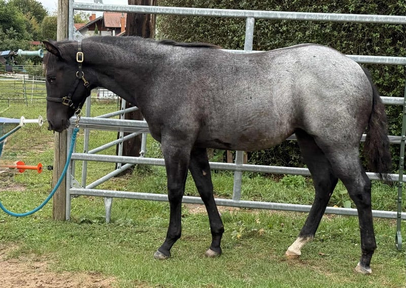 Iconic Vespa - eine außergewöhnlich schöne Quarter Horse Stute, geboren am 09.03.2025, in der seltenen und begehrten Farbe Blue Roan. Sie ist homozygot auf Schwarz und trägt kein Agouti, was sie genetisch besonders interessant macht. Mit einem geschätzten Endmaß von ca. 150 cm bringt sie ein kompaktes, korrekt gebautes und kräftiges Exterieur mit. Ihre Bemuskelung ist altersentsprechend hervorragend entwickelt und sie präsentiert sich rundum gesund. Vespa wächst artgerecht im Herdenverband mit anderen Fohlen auf und kennt bei Abgabe sowohl Tierarzt als auch Hufschmied. Sie ist dann altersgemäß geimpft, regelmäßig entwurmt und bestens sozialisiert. Der tägliche Umgang ist für sie selbstverständlich - sie wird liebevoll gehändelt, zeigt sich dabei stets brav, unkompliziert und menschenbezogen. Ihr Charakter ist auffallend anhänglich, verschmust und nervenstark. Kuscheleinheiten genießt sie sichtlich, was sie zu einem echten Herzenspferd macht. Bewegungstechnisch bringt sie viel mit: Sie ist ein talentierter Beweger mit einem ruhigen, kontrollierten Gangwerk und stammt aus einem bewährten Outcross von Gunner und Hancock - eine Kombination, die sich bereits vielfach im Reining- und Allroundbereich bewährt hat. Damit bietet sie beste Voraussetzungen für den Einsatz im Sport, auf Turnieren oder auch als zuverlässige Freizeitpartnerin mit dem gewissen Etwas. Iconic Vespa wird mit AQHA-Papieren sowie einem Equidenpass abgegeben. Selbstverständlich kennt sie bei Abgabe die wichtigsten Grundlagen des Fohlen-ABCs und ist bereit für ihren weiteren Weg. Wer ein talentiertes, wunderschönes und charakterstarkes Nachwuchspferd mit hervorragender Abstammung sucht, wird in Iconic Vespa eine ganz besondere Partnerin finden.