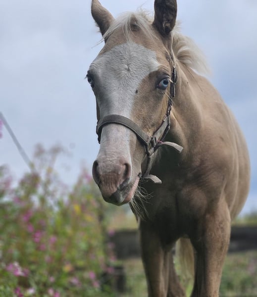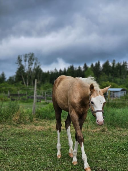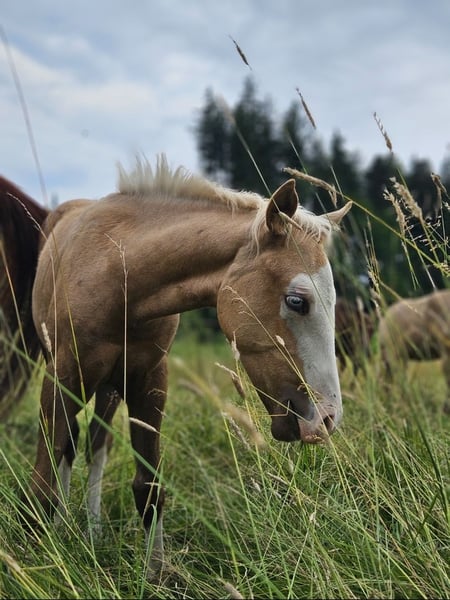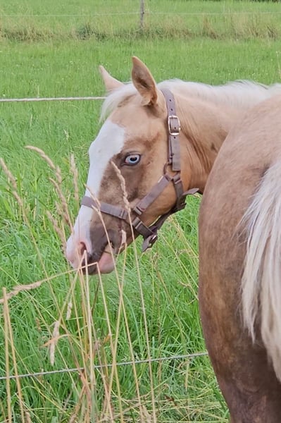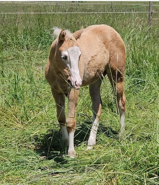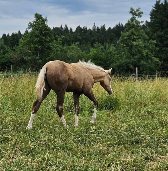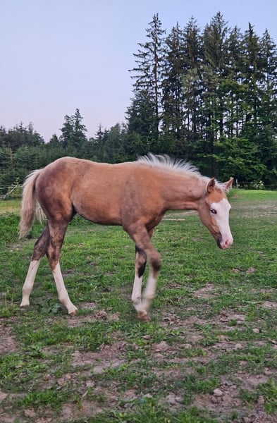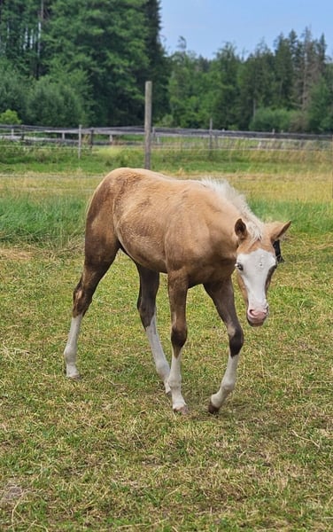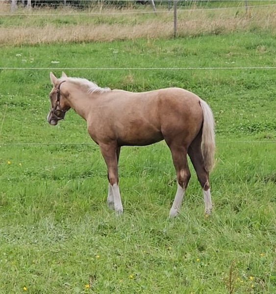 Wanda - ein Traum auf 4 Beinen. Quarter Horse Stutfohlen, 3.25 geboren mit einem geschätzten Endmaß von 152 cm, verzaubert jeden mit ihrem Blick und ihrem Aussehen. Sie hat die wundervolle Farbe Palomino mit interessantem Abzeichen am Kopf. Wanda ist ein sehr gut gelungenes Fohlen, mit korrektem, kräftigem Körperbau und tollen Bewegungen. Das Fohlen ist bisher noch etwas zurückhaltend, taut aber langsam auf und wird neugieriger. Sie ist immer freundlich und brav im Umgang. Später will sie mal Sportler werden und zeigt das durch ein spritziges Verhalten. Das Fohlen wird täglich gehändelt, kennt Hufschmied und Tierarzt und das Fohlen ABC bei Abgabe. Später wird sie sicherlich ein guter Partner in den Reining Klassen werden, aber aufgrund ihrer guten Bewegungen auch interessant für Ranch Riding, Ranch Rail etc.. Wanda`s Abstammung lässt jeden Reining Fan das Herz höher schlagen: Spooks Gotta Gun, Shining Spark, Peponita, Topsail Flashy Jac. Ihr Vater ist der erfolgreich geshowte Spooks Grand Slam (LTE: 150.000 $). Auf Wunsch kann sie zur Aufzucht bleiben.