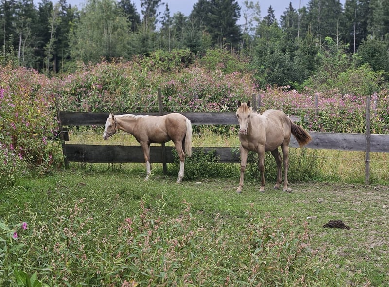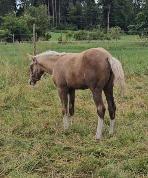 Wanda - ein Traum auf 4 Beinen. Quarter Horse Stutfohlen, 3.25 geboren mit einem geschätzten Endmaß von 152 cm, verzaubert jeden mit ihrem Blick und ihrem Aussehen. Sie hat die wundervolle Farbe Palomino mit interessantem Abzeichen am Kopf. Wanda ist ein sehr gut gelungenes Fohlen, mit korrektem, kräftigem Körperbau und tollen Bewegungen. Das Fohlen ist bisher noch etwas zurückhaltend, taut aber langsam auf und wird neugieriger. Sie ist immer freundlich und brav im Umgang. Später will sie mal Sportler werden und zeigt das durch ein spritziges Verhalten. Das Fohlen wird täglich gehändelt, kennt Hufschmied und Tierarzt und das Fohlen ABC bei Abgabe. Später wird sie sicherlich ein guter Partner in den Reining Klassen werden, aber aufgrund ihrer guten Bewegungen auch interessant für Ranch Riding, Ranch Rail etc.. Wanda`s Abstammung lässt jeden Reining Fan das Herz höher schlagen: Spooks Gotta Gun, Shining Spark, Peponita, Topsail Flashy Jac. Ihr Vater ist der erfolgreich geshowte Spooks Grand Slam (LTE: 150.000 $). Auf Wunsch kann sie zur Aufzucht bleiben.