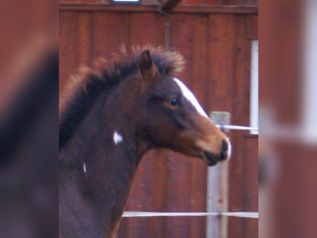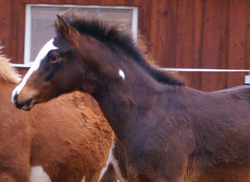 Sympathisches Quarter Pony Hengstfohlen, Dunkelbraun mit spots, Vater: Paint Horse Kingsley n jills wood, Mutter: Deutsches Reitpony von Kennedy WE, das Fohlen hat komplette Papiere, Pass vom ZSSE, wächst mit anderen Fohlen zusammen auf, aufgeschlossener kleiner Herzensbrecher mit markanter Blesse und einem herzförmigen Abzeichen am Hals, leichtfüßige grosse Bewegungen